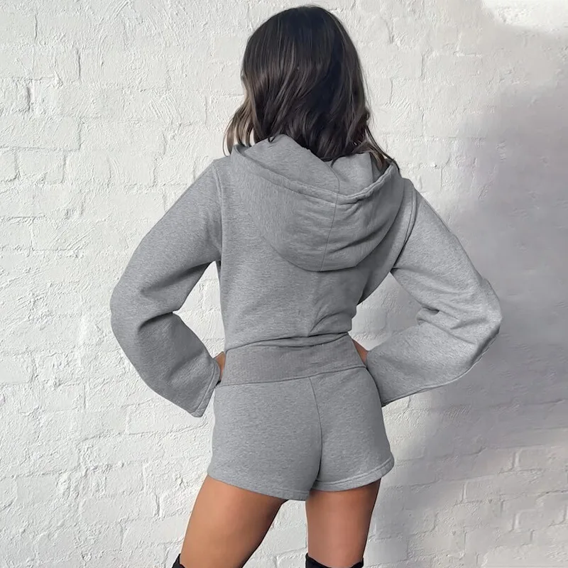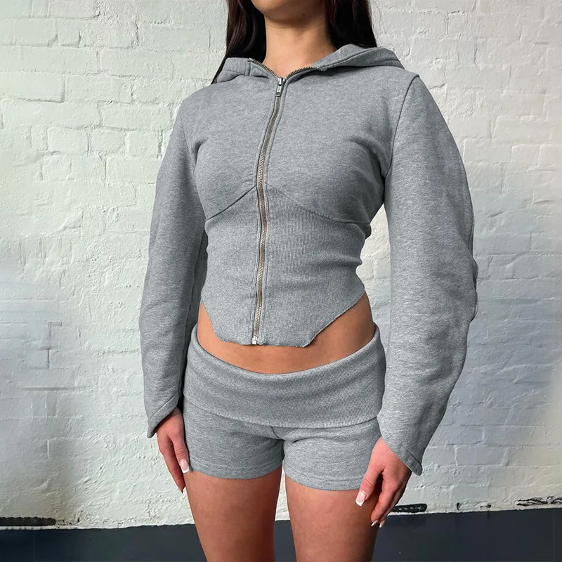 C2018 New Arrivals Zipper Long Sleeved Hooded Cardigan High Waisted Slim Fit Shorts Two Piece Set Wholesale