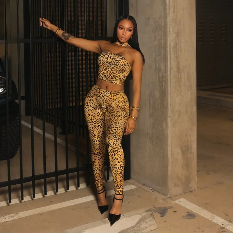 C0239 Women's Leopard Print Hanging Neck Strapless Top, Tight Pants Two Piece Set