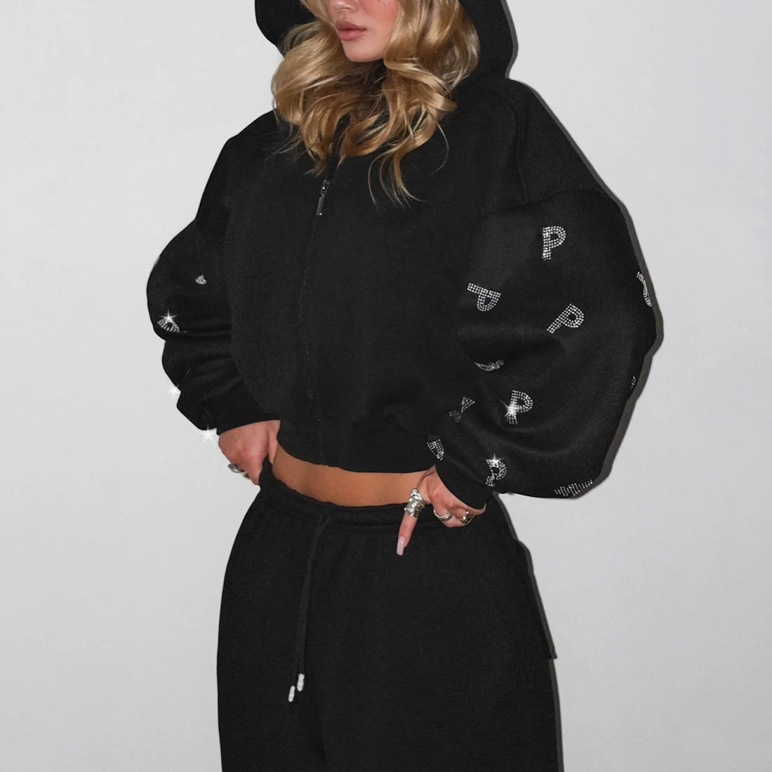 C0190 Winter New Women's Clothing Letter Hot Diamond Hooded Sweatshirt Joggers Pants Set
