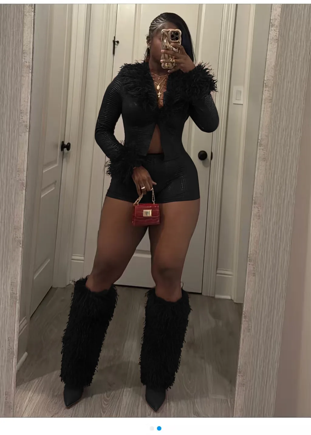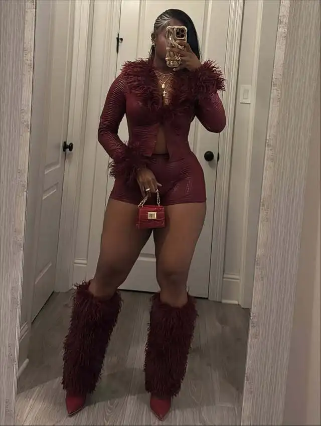 C2470 Available Wholesale Hot Selling Snake Patterned Long Sleeved Fur Collar Shorts Stretch PU Leather Two Piece Set