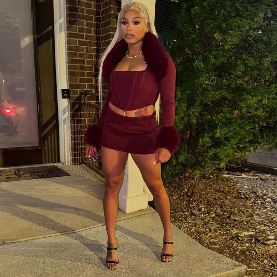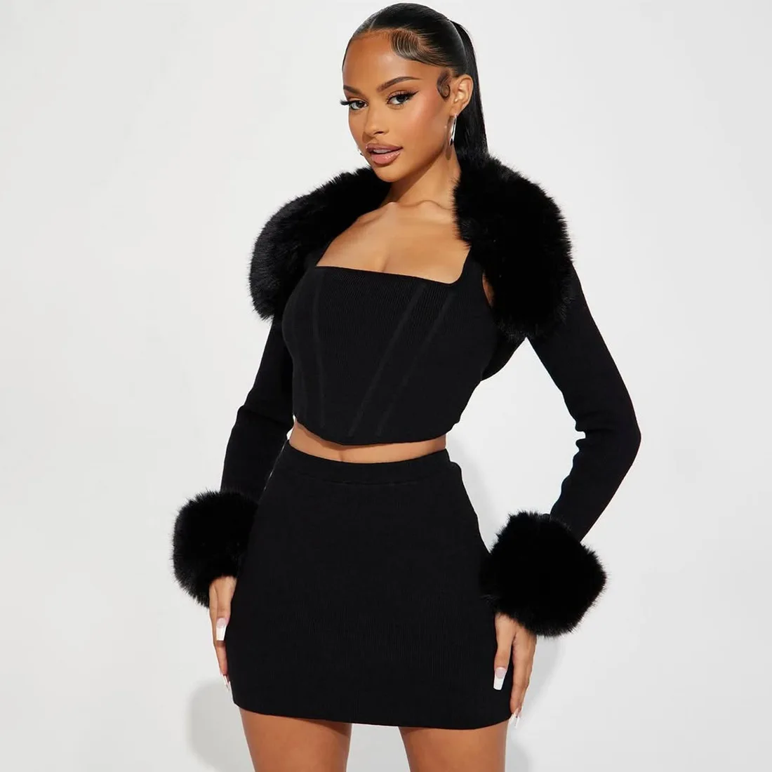C1511 Winter New Women's Fashion Fur Collar Patchwork Long Sleeved Sexy Short Skirt Knitting Set