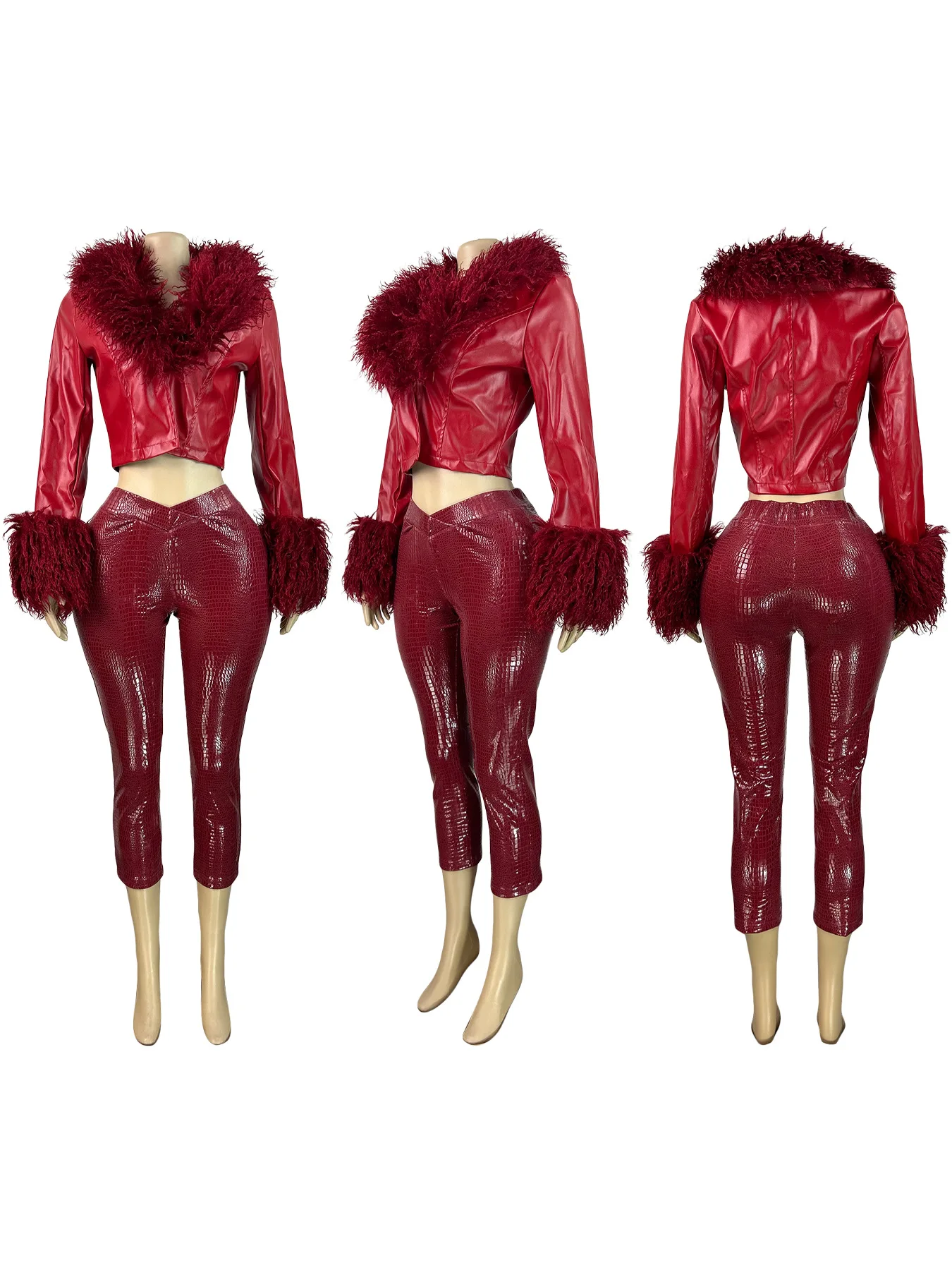 C1462 Women's Hot Stamping PU Leather Shorts, Fur Collar Jacket, Casual 2-piece Set