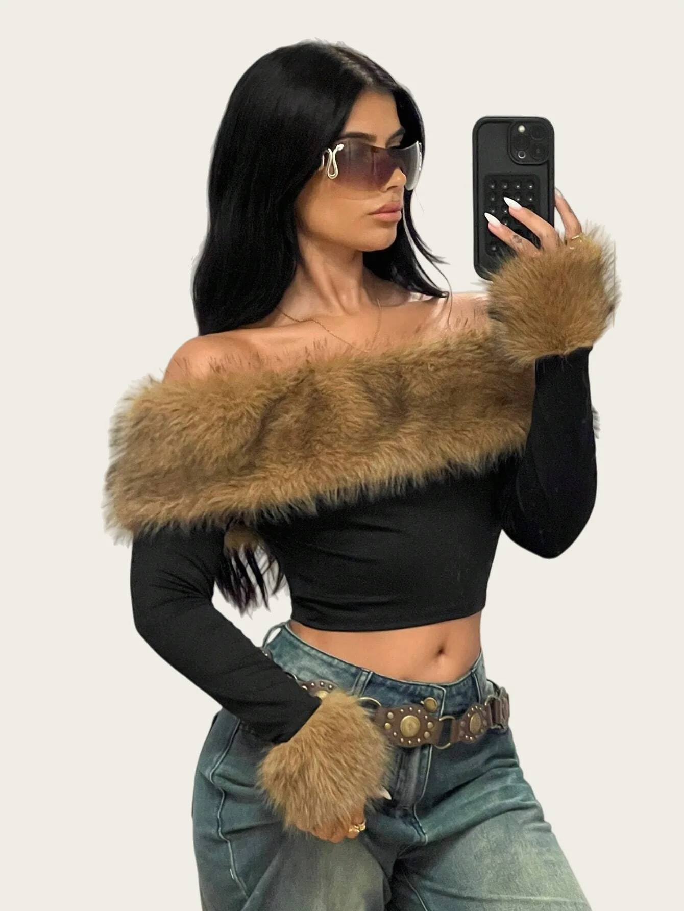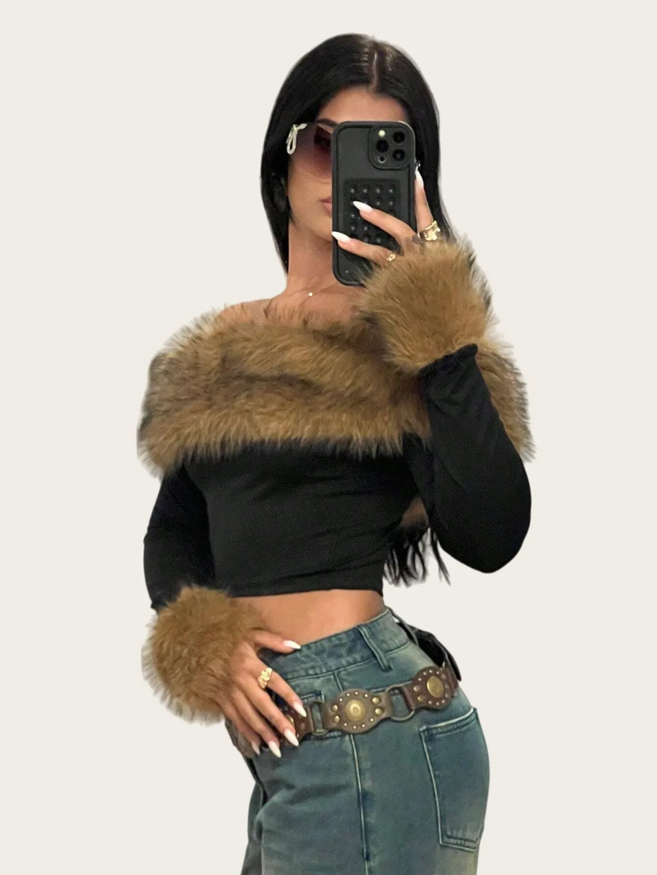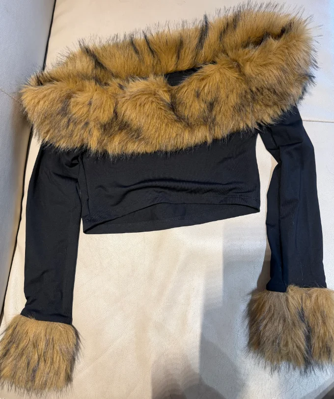 Wholesale Fall 2025 Boutique Fashion Women Long Sleeve Furs Crop Top T Shirt