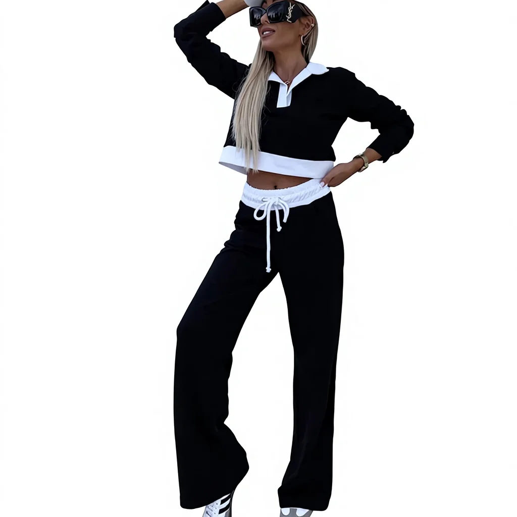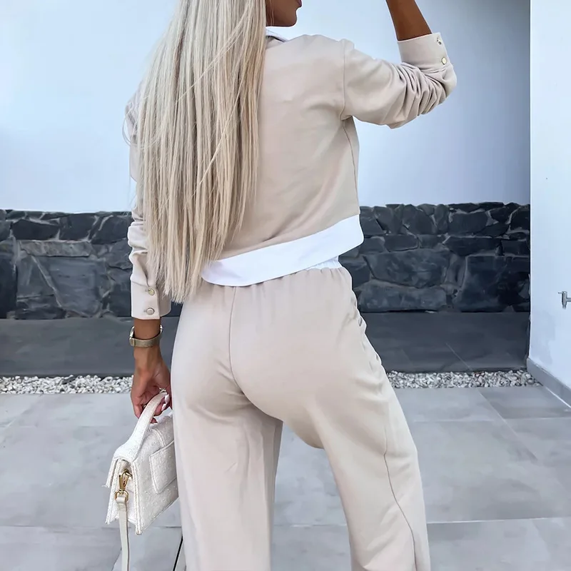 Cross-Border Women's Loose Autumn Long-Sleeved Lapel Solid Top Casual Drawstring Pants Fashion Suit Spandex/Cotton Fleece