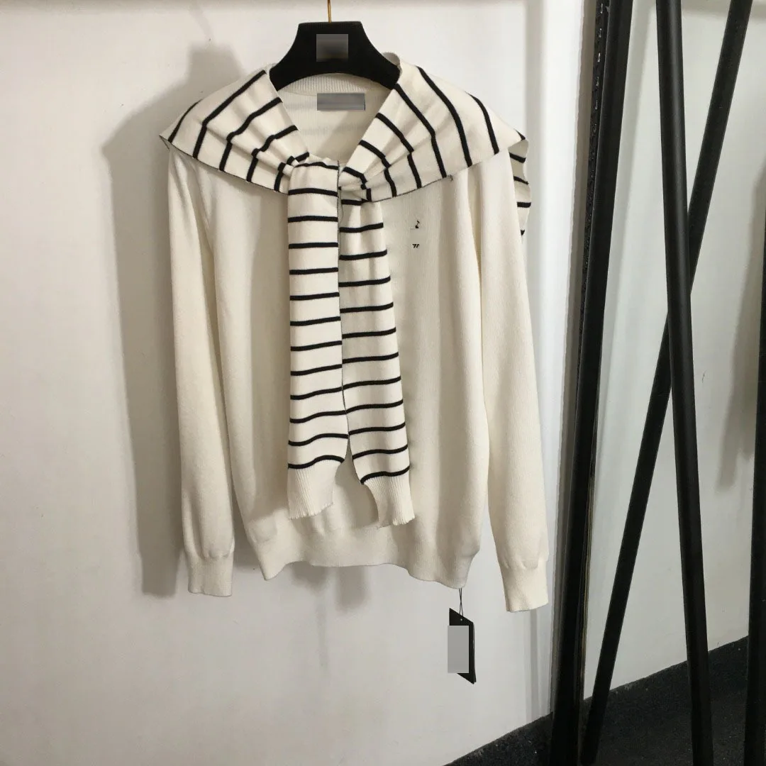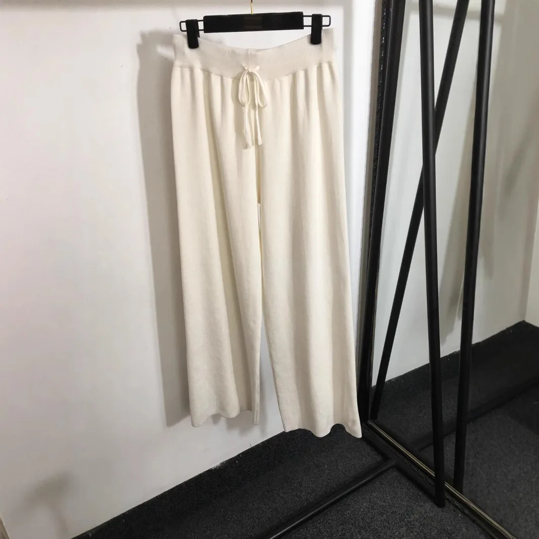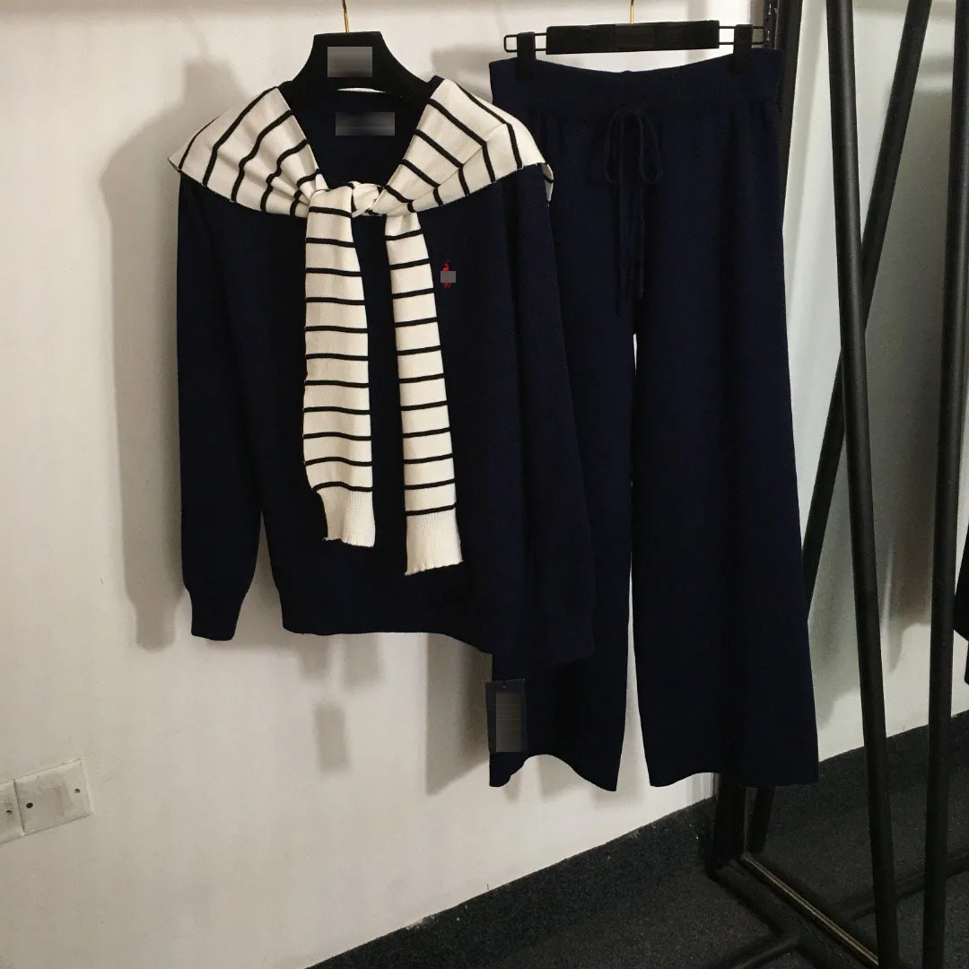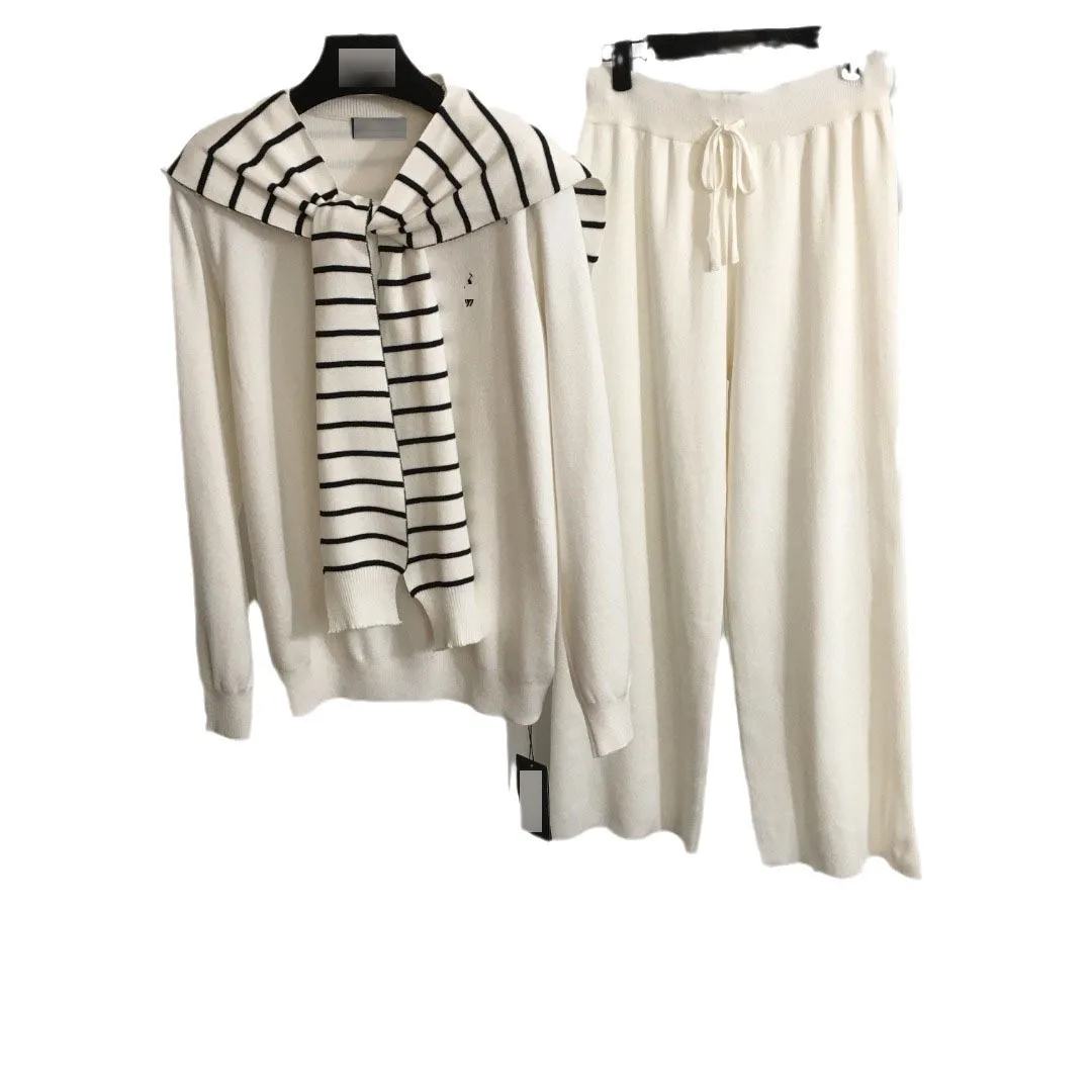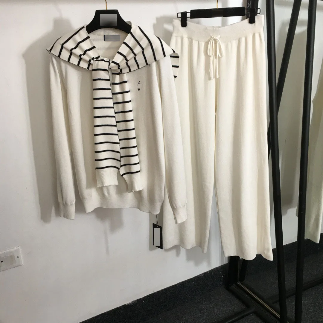 Winter Casual New Knitted Fleece Set Polo Striped Shawl Pullover Long Sleeve Sweater and High Waist Wide Leg Pants