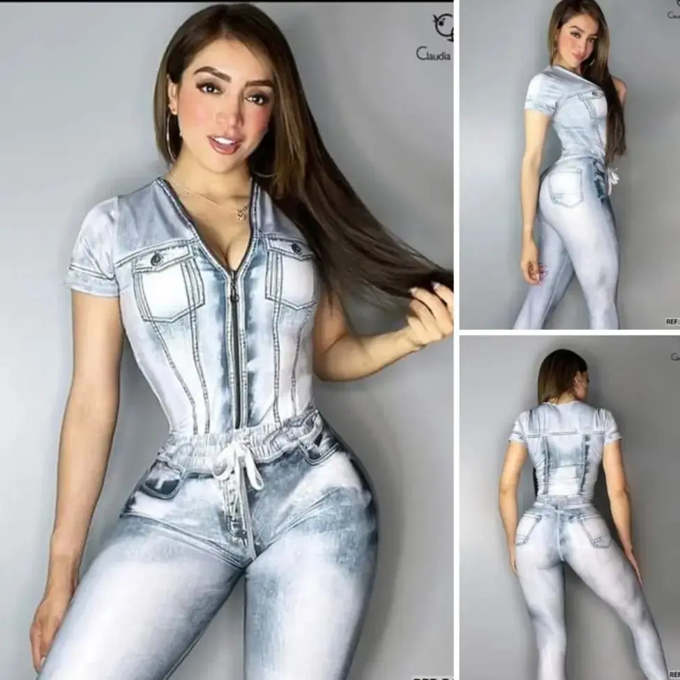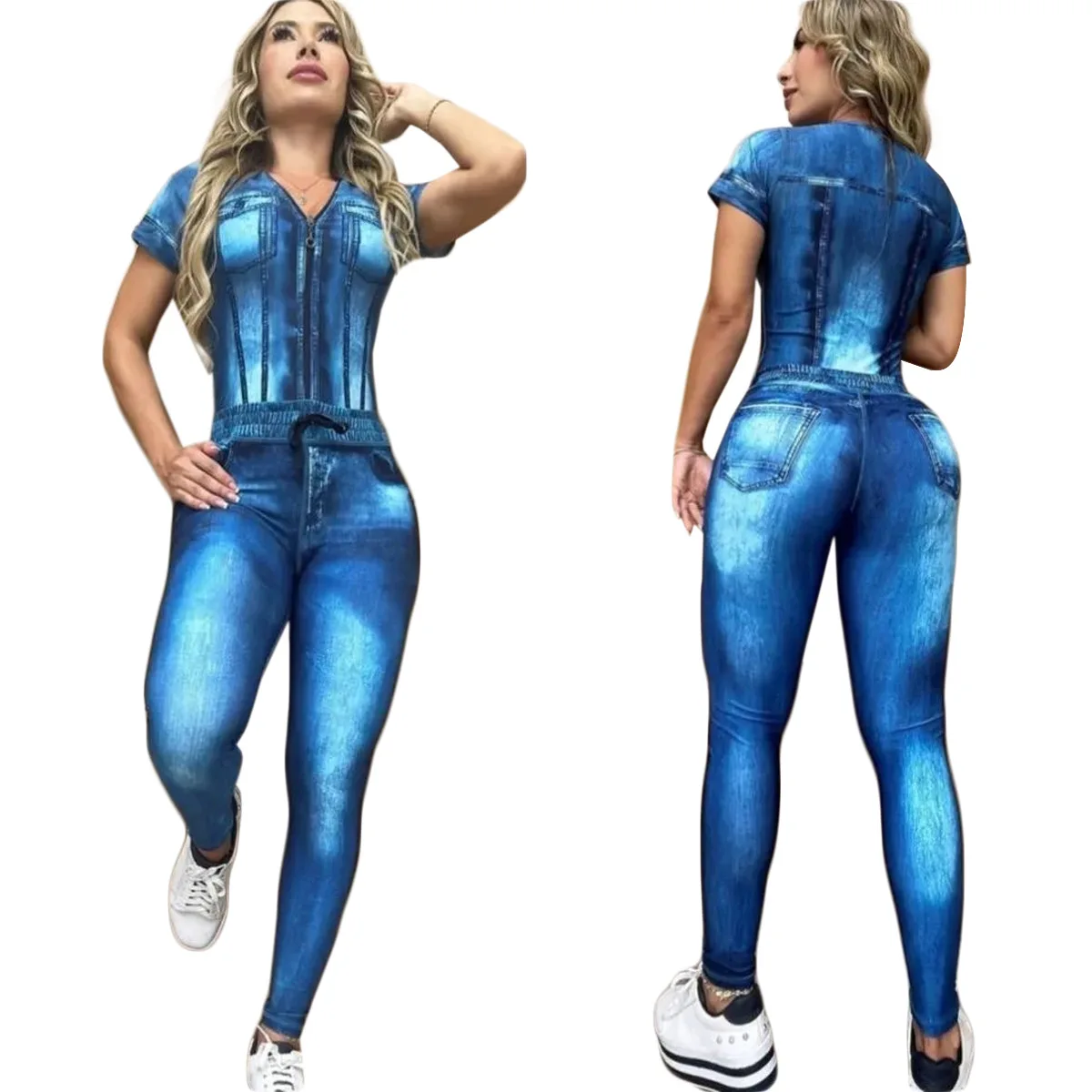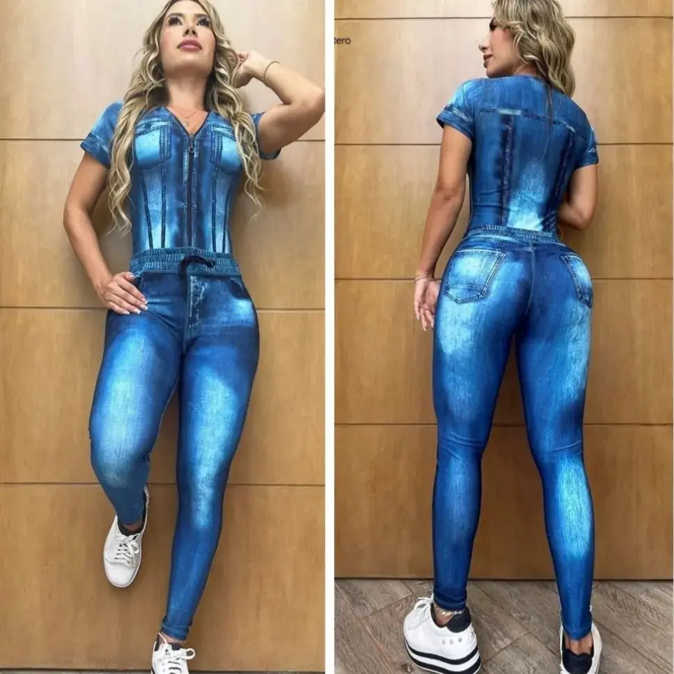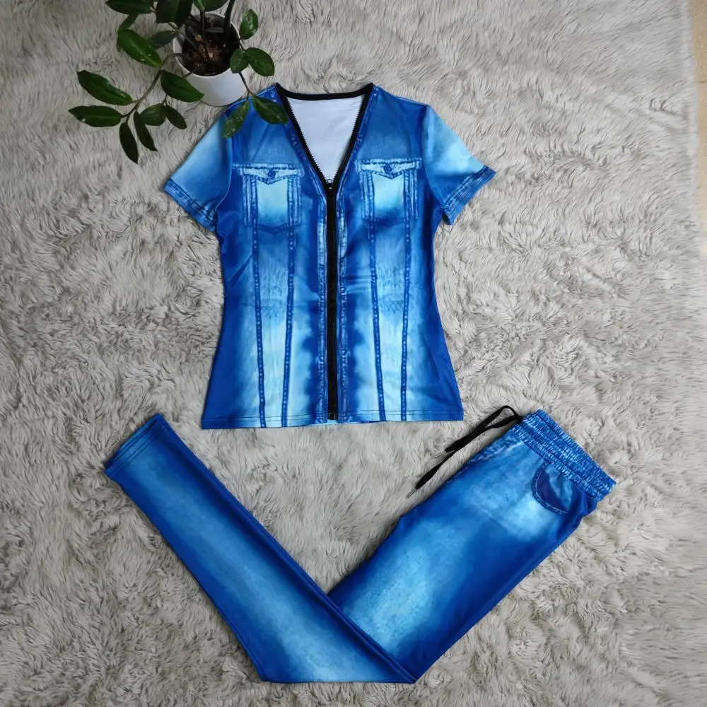 European American Cross-Border Women's Casual Fashion New Denim Print Short Sleeve Top Long Pants Regular Fit Elegant Spring