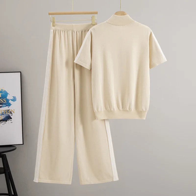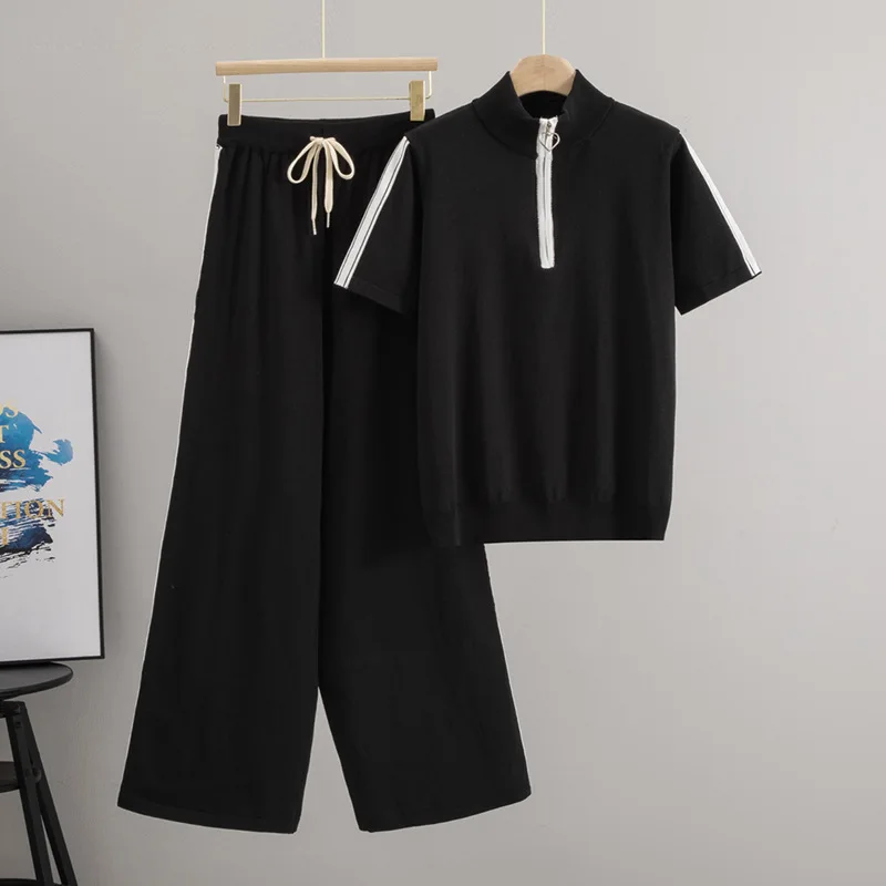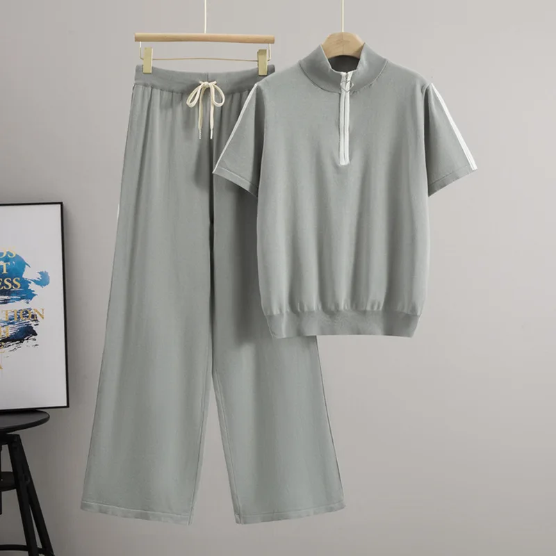 Women's Summer Two-Piece Casual Suit Knitted Half Zip High Waist Lace-Up Trousers Short Sleeve Solid Loose Fit 100% Polyester