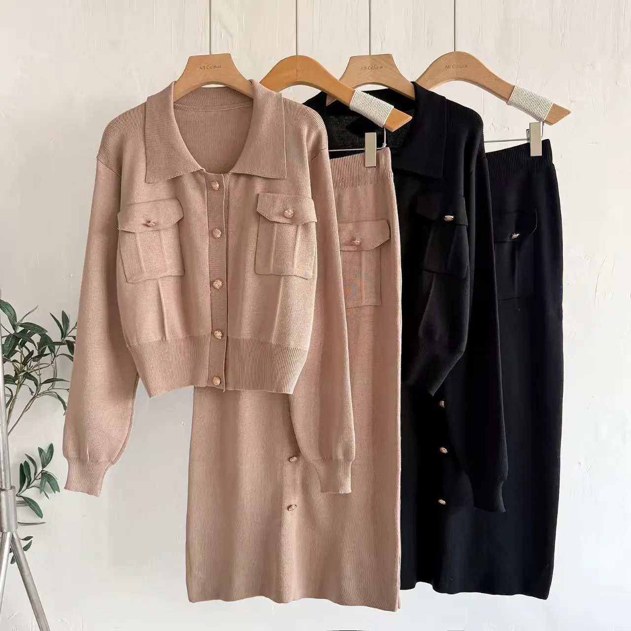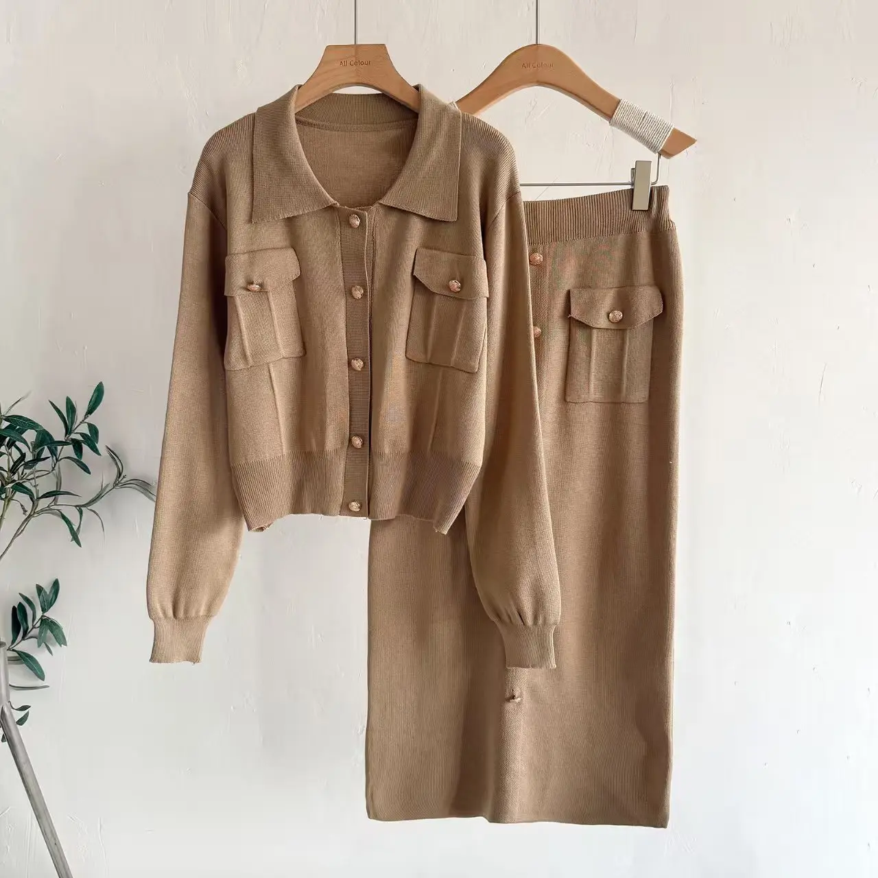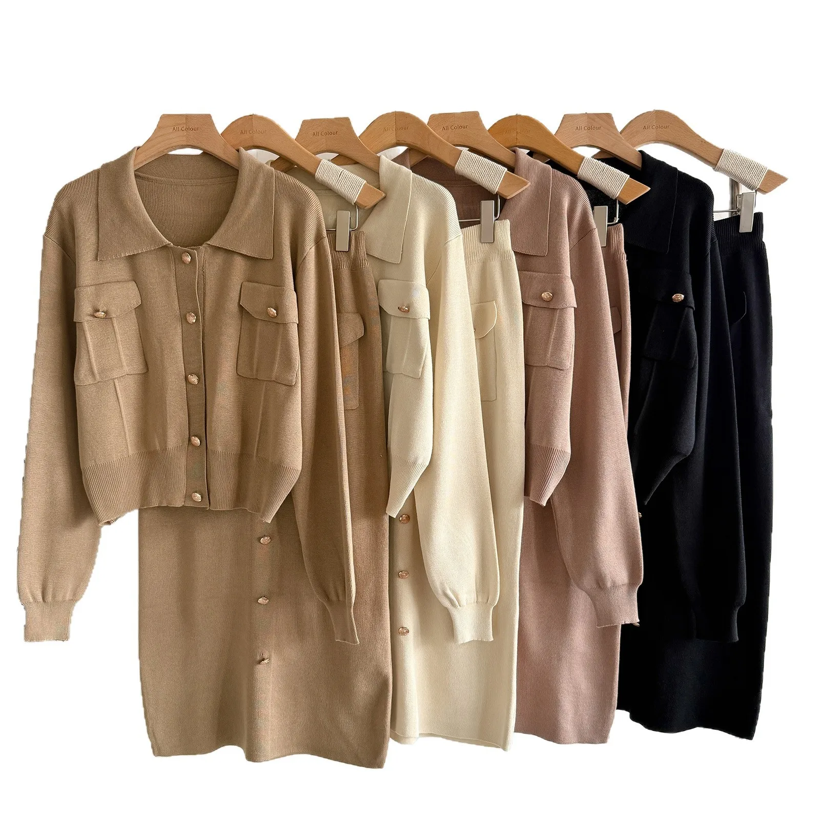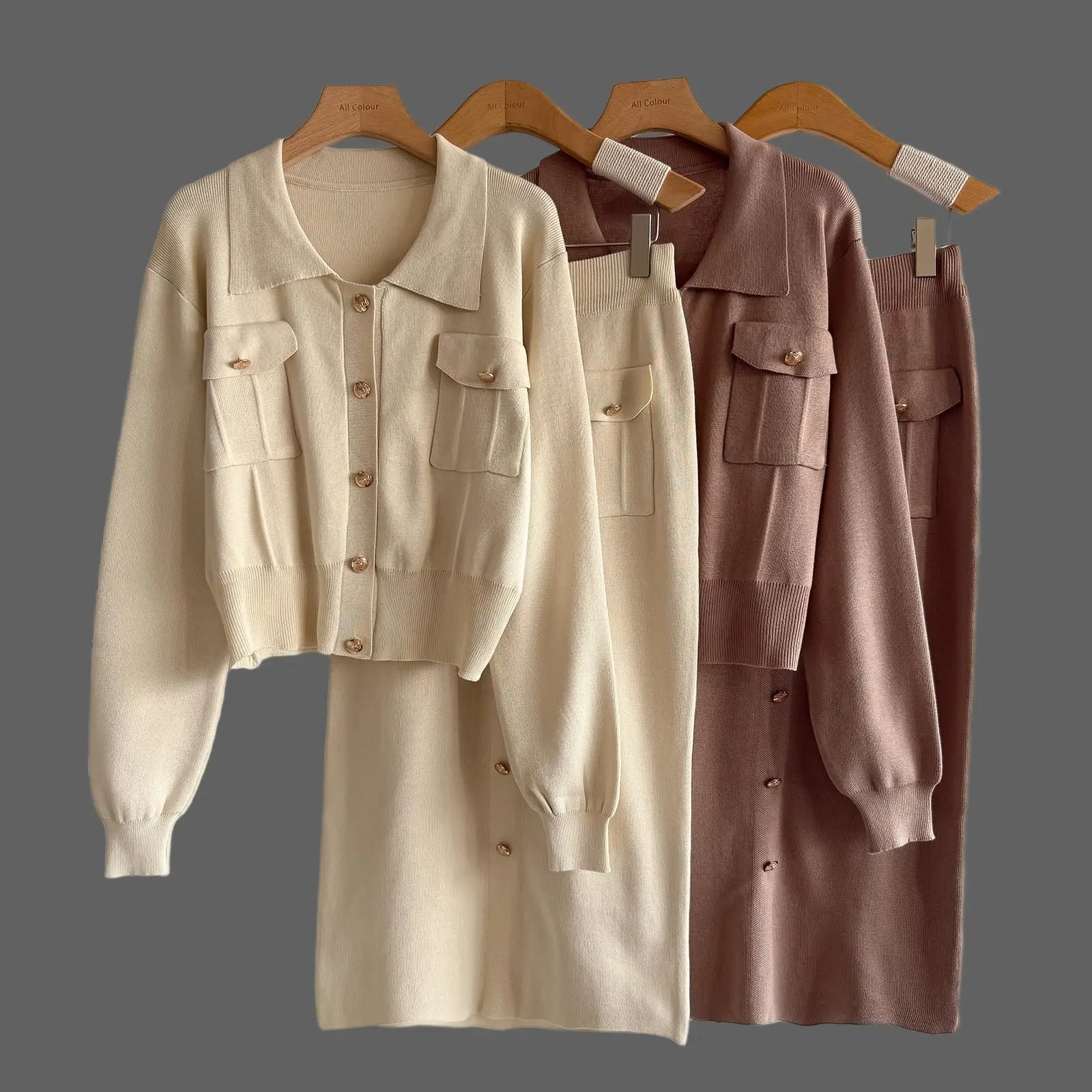 Cross-border French Lapel Suit Winter Casual Solid Sweater Women's Cardigan Top Knitted Loose Skirt Two-piece Set Anti-Pilling