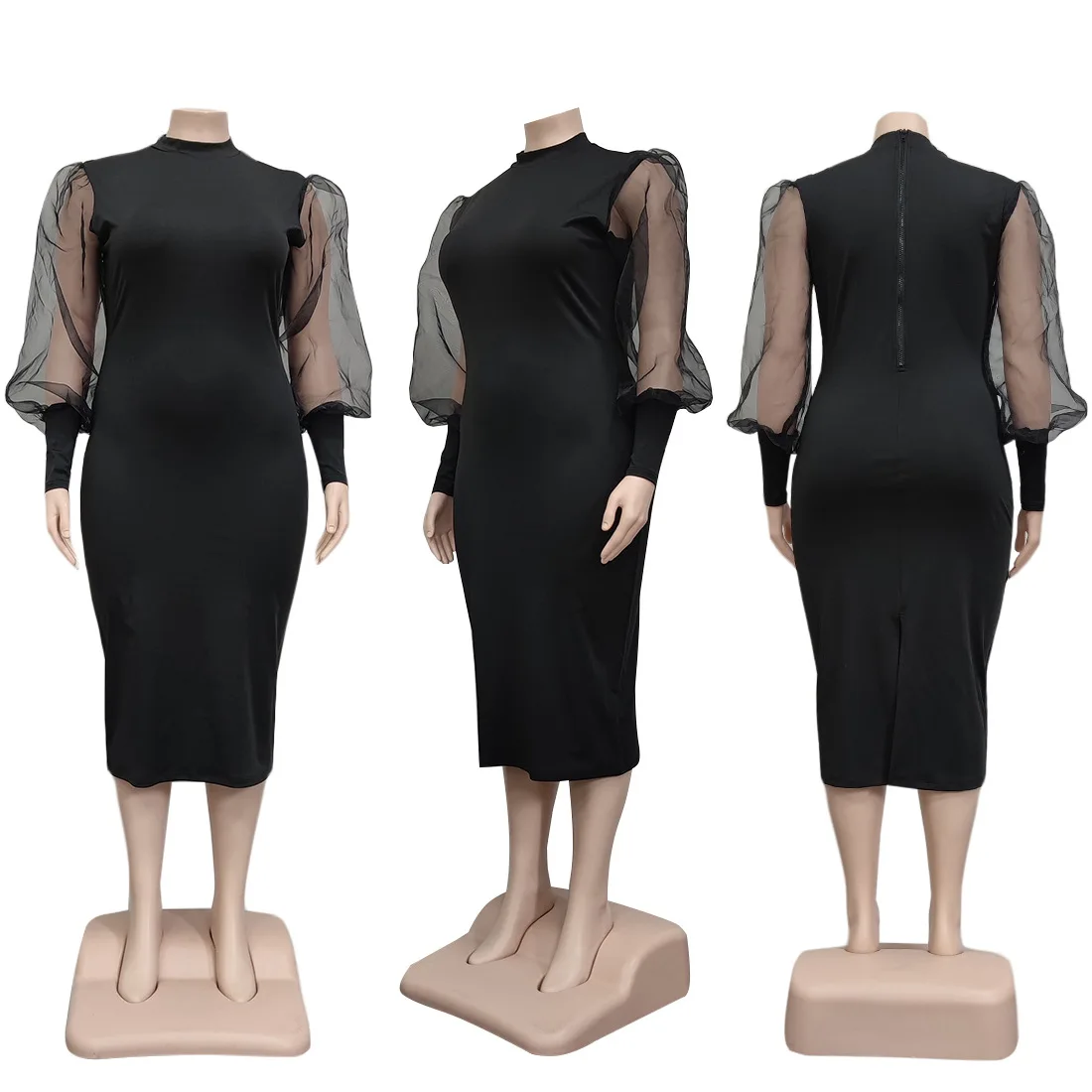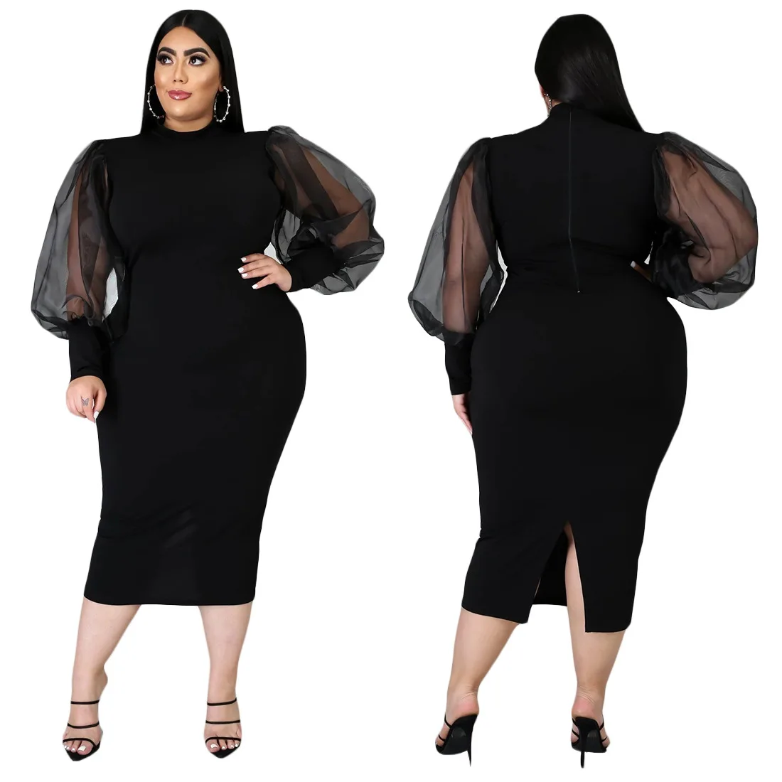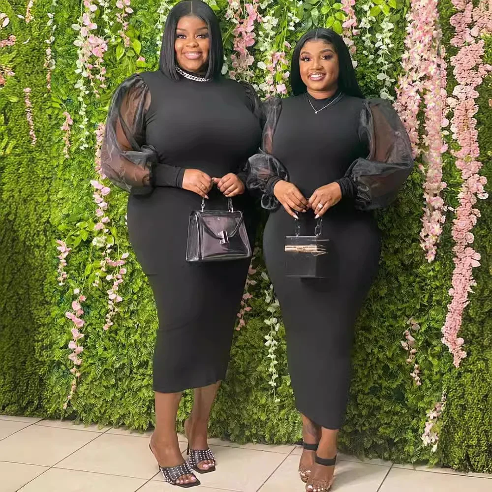 New Mesh See-Through Bodycon Dress for Plus Size Women Natural Waist Vintage Casual Summer Lantern Sleeve