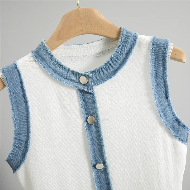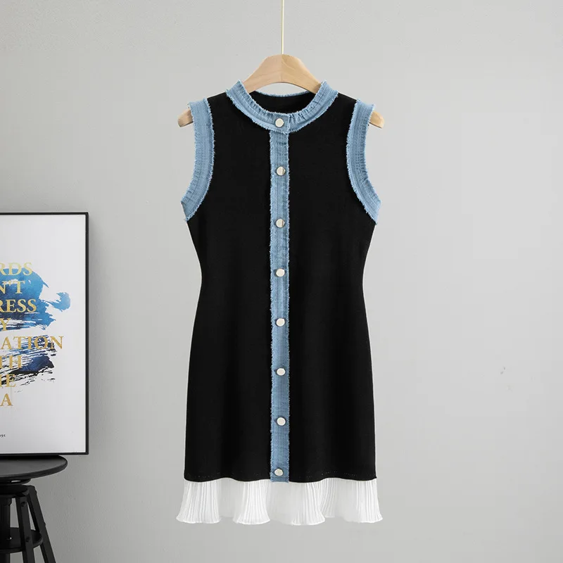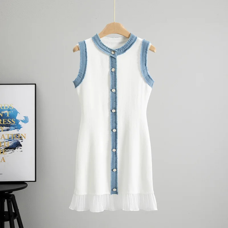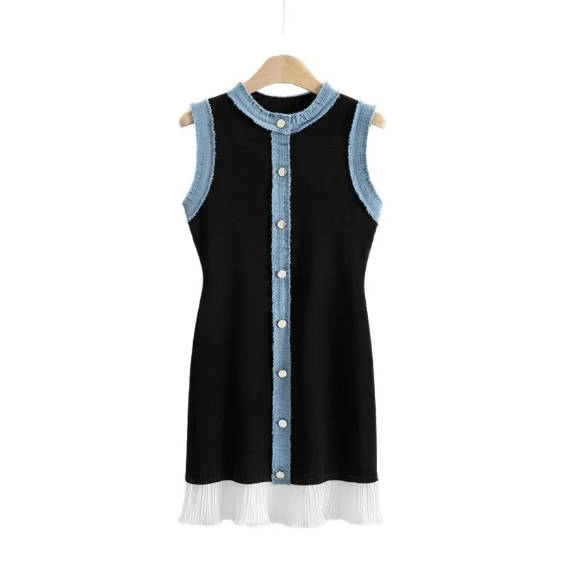 Women's Summer Casual Solid Button Natural Waist Knitted Mini Dress with Washed Denim Vest