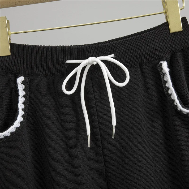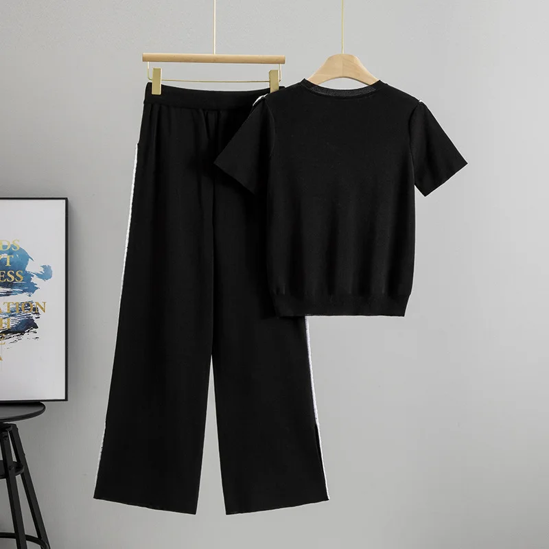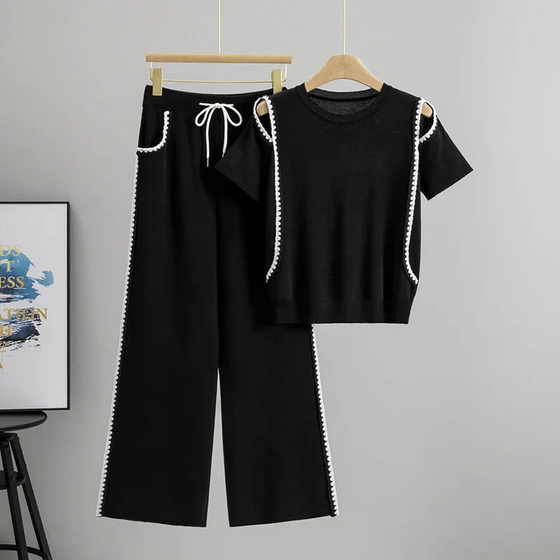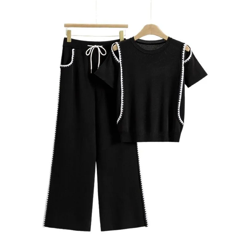 Cross-Border Summer New Style Women's Two-Piece Set Daily Wear Fashion Casual Slimming Sports Off-Shoulder Knitted Short Sleeve