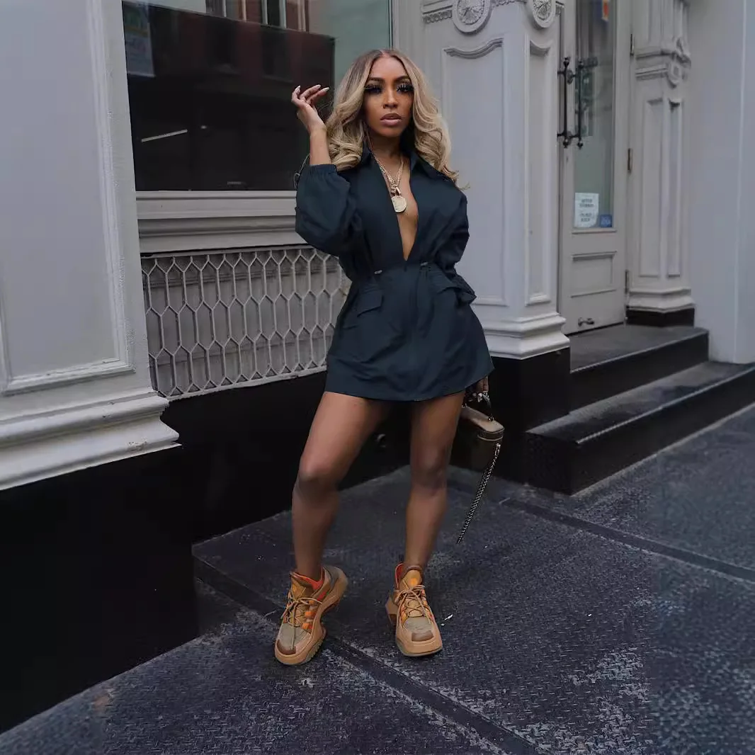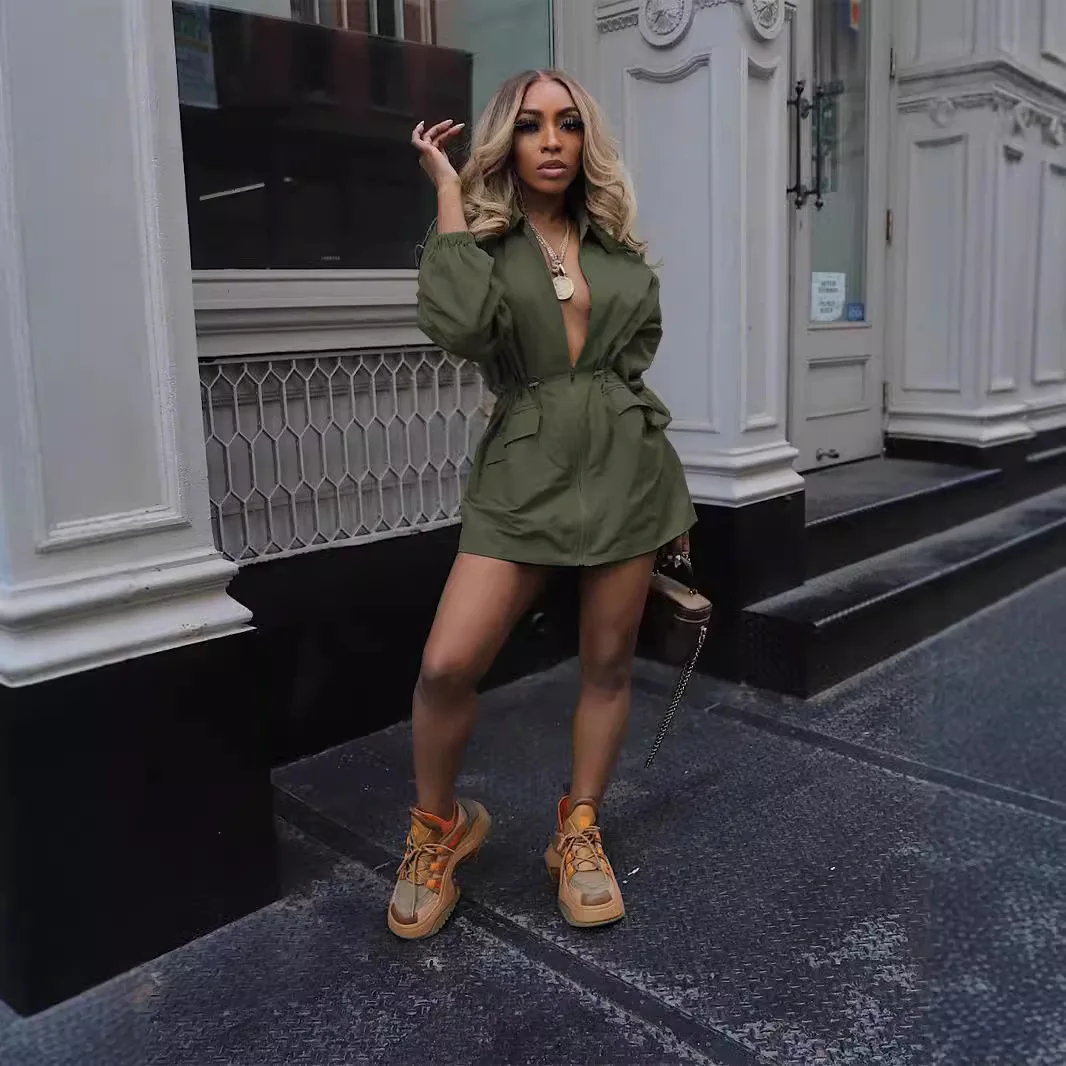 Women's Autumn Fashion Mid-Length Windbreaker European American Style Drawstring Waist A-Line Casual Loose Worsted Fabric