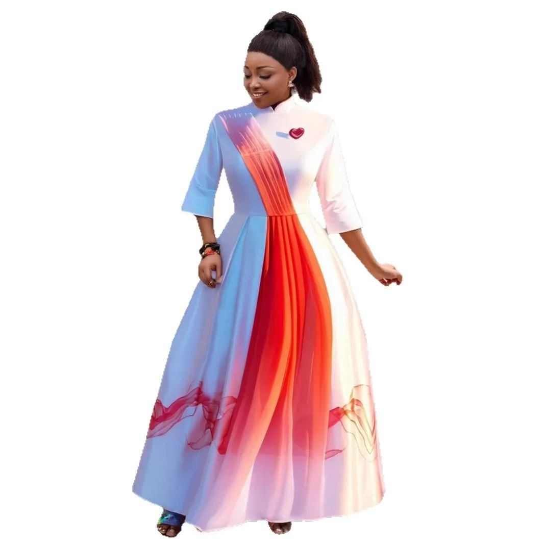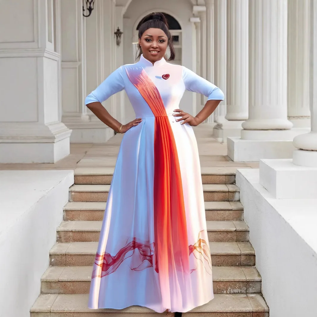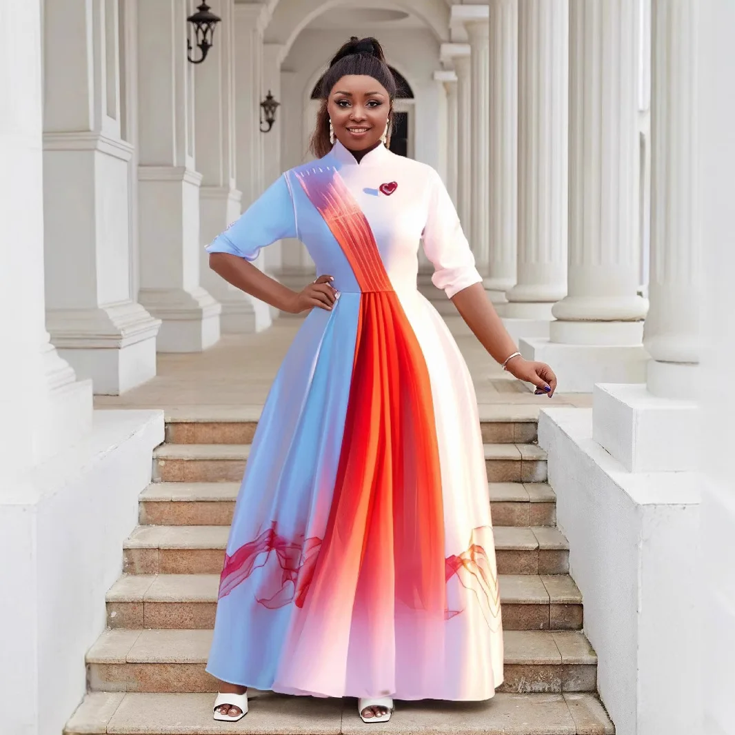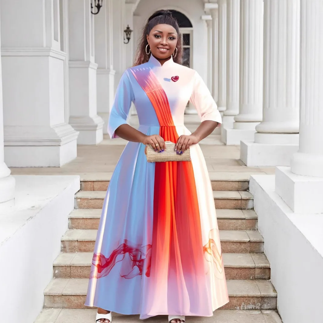 ZYHT 73963 Matte Satin Printed Geometric Pattern Maxi Women Asymmetric One Shoulder Ruched Hem Women Dress