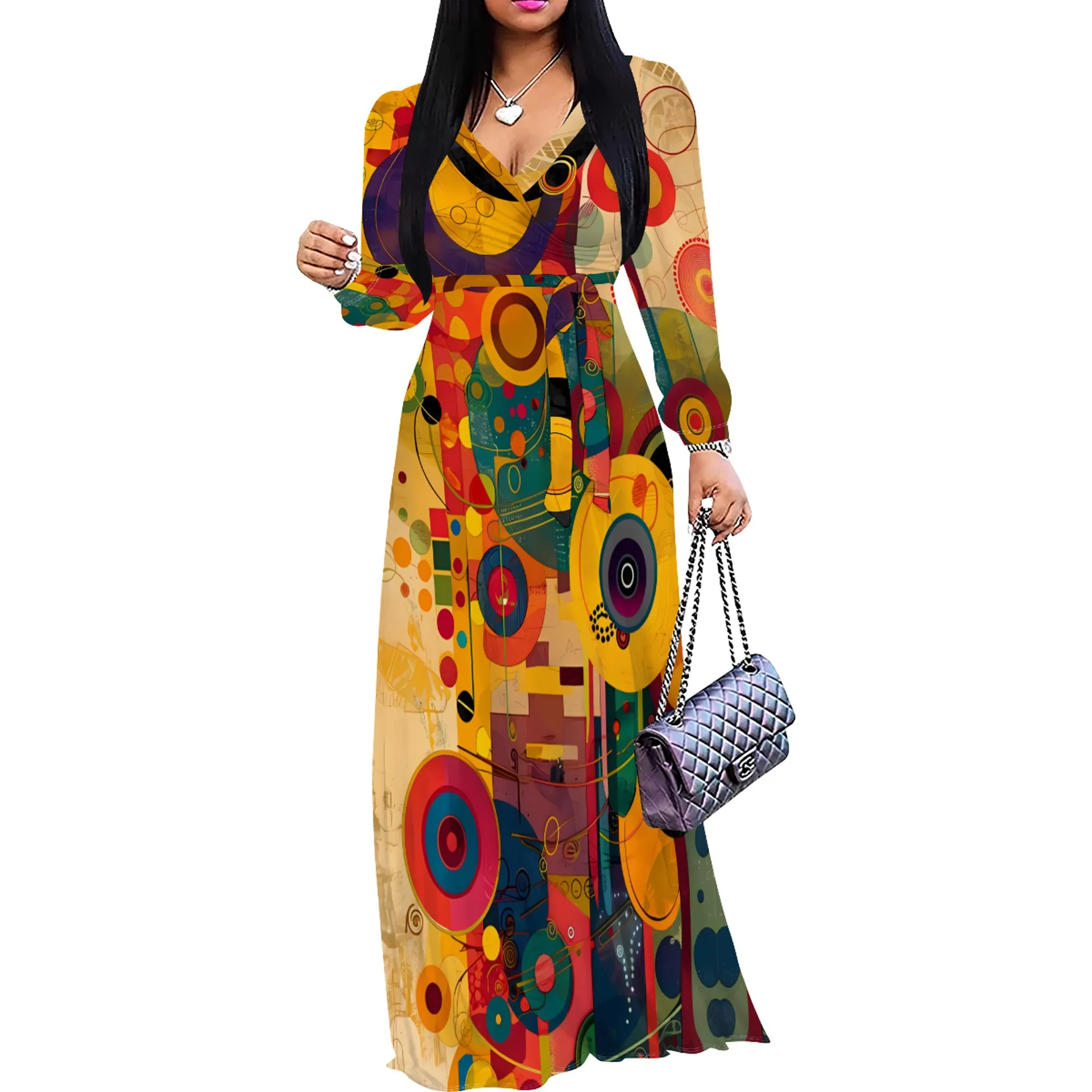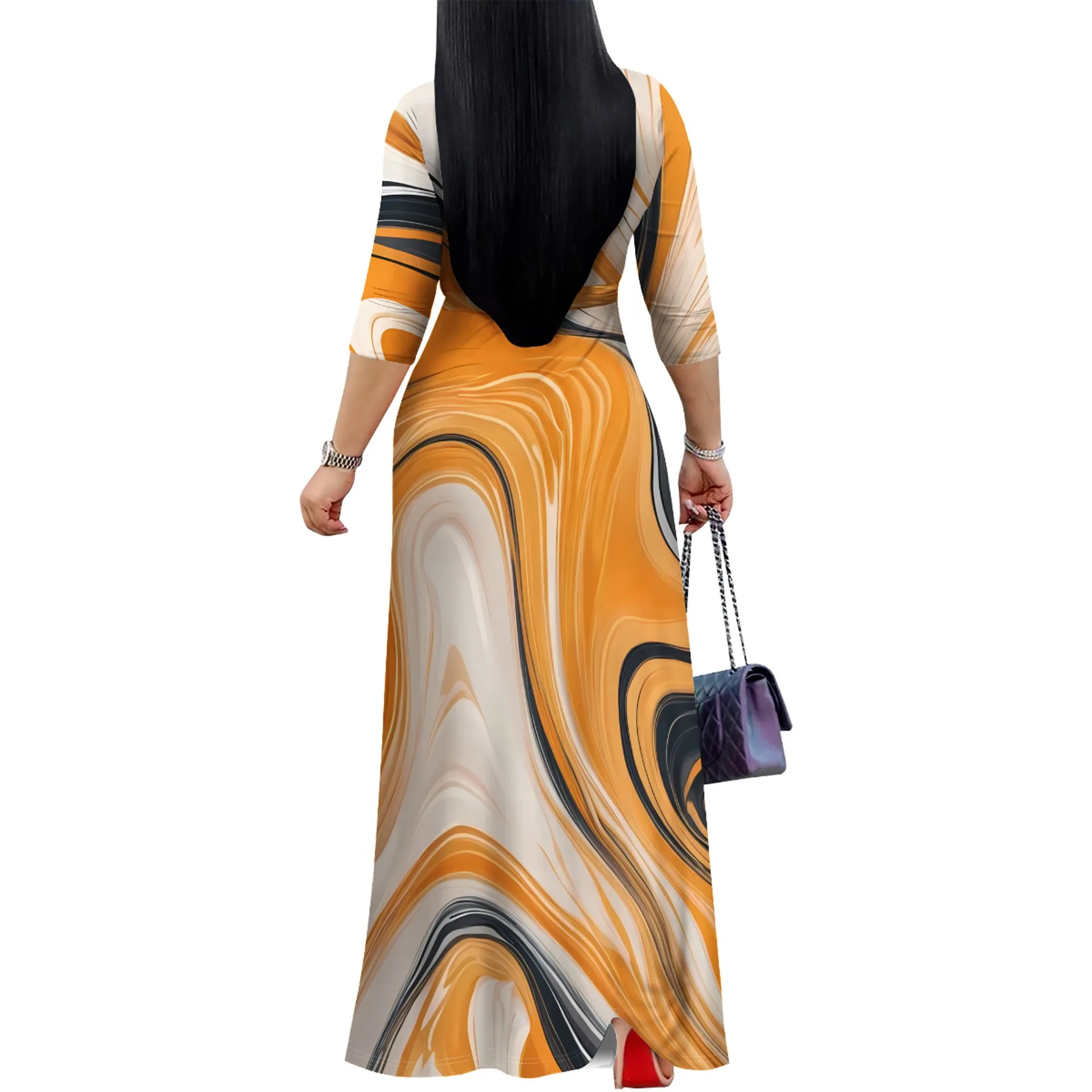 Best-Selling Elegant Loose Chiffon Floor-Length V-neck Three-Quarter Sleeve Floral Print Dress for Women European American