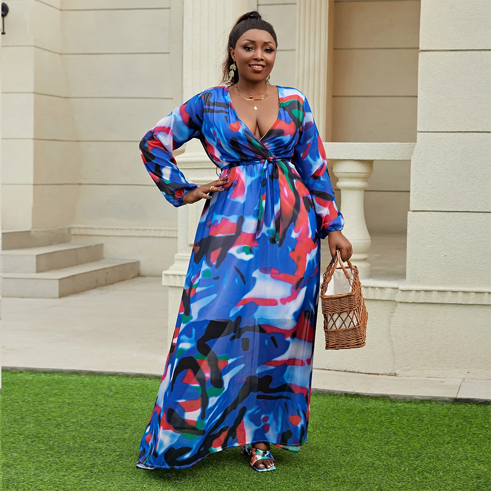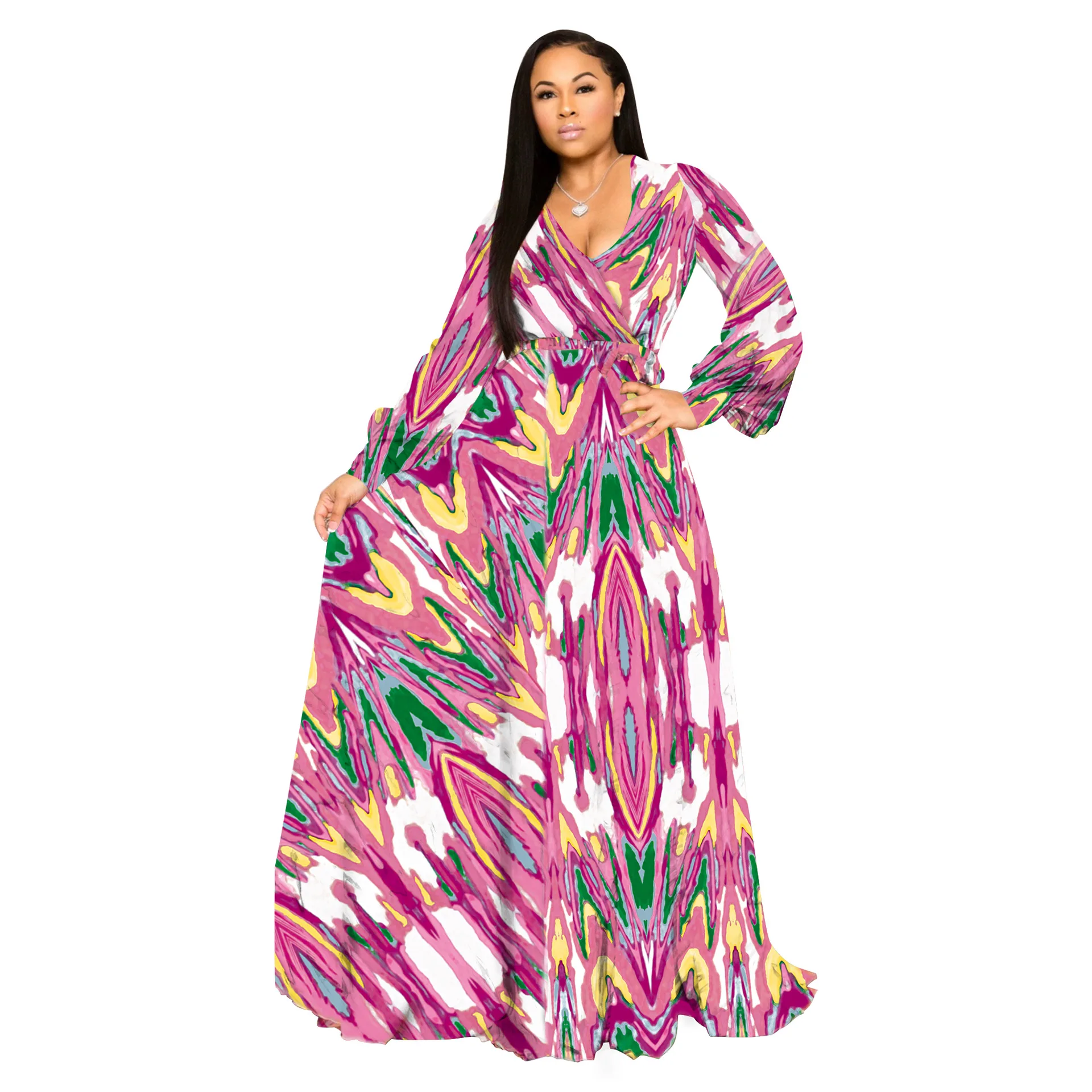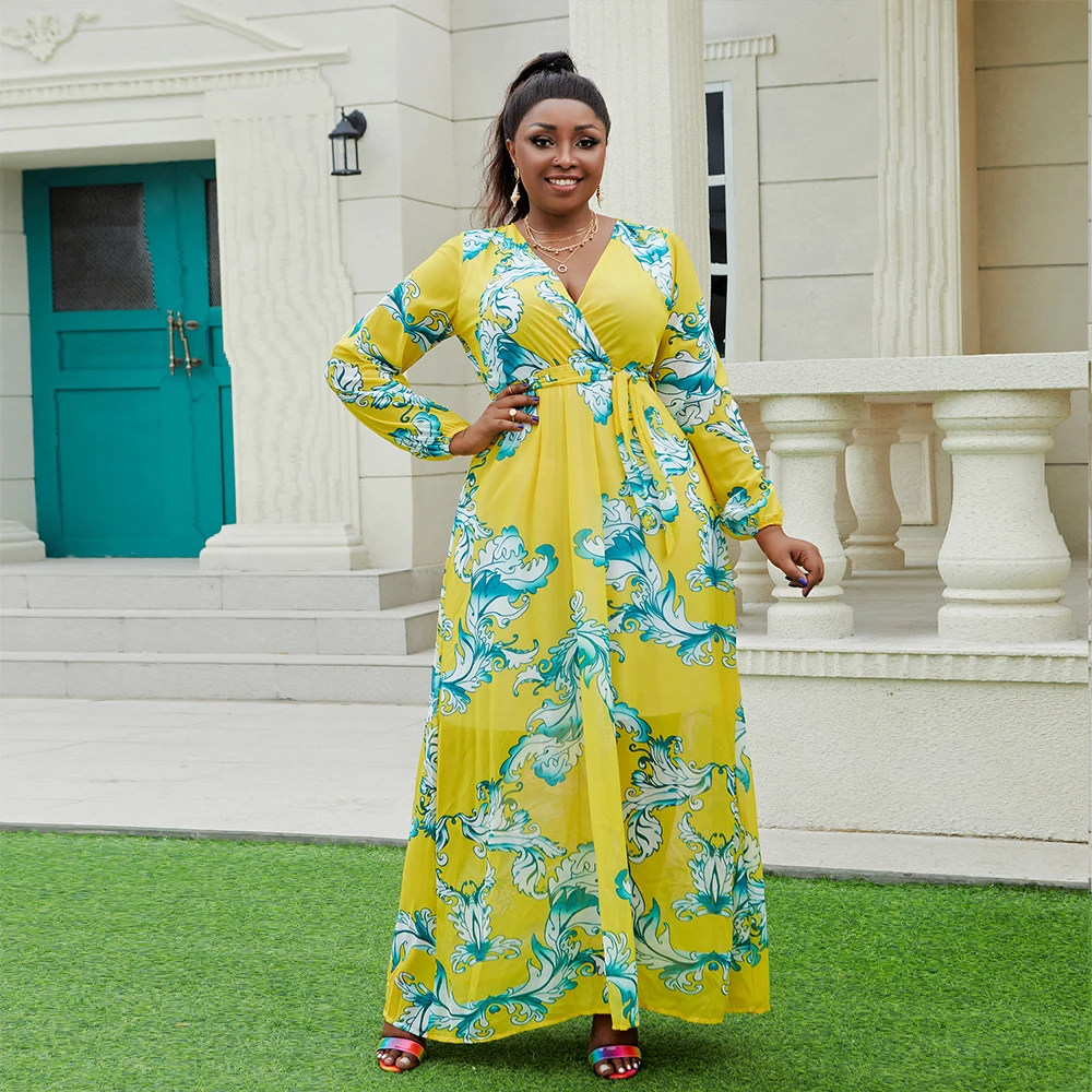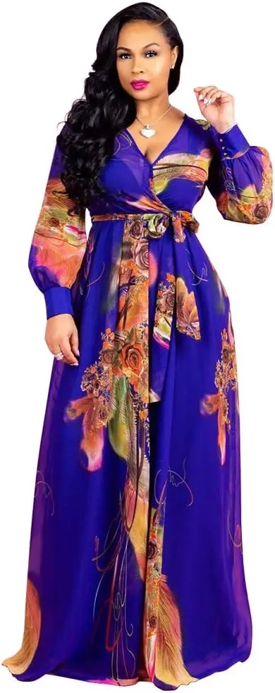 Women's Floral Print Maxi Dress 2024 Spring Summer V-Neck Long Sleeve Boho Style Chiffon Beach Wedding Guest Natural Belt ODM