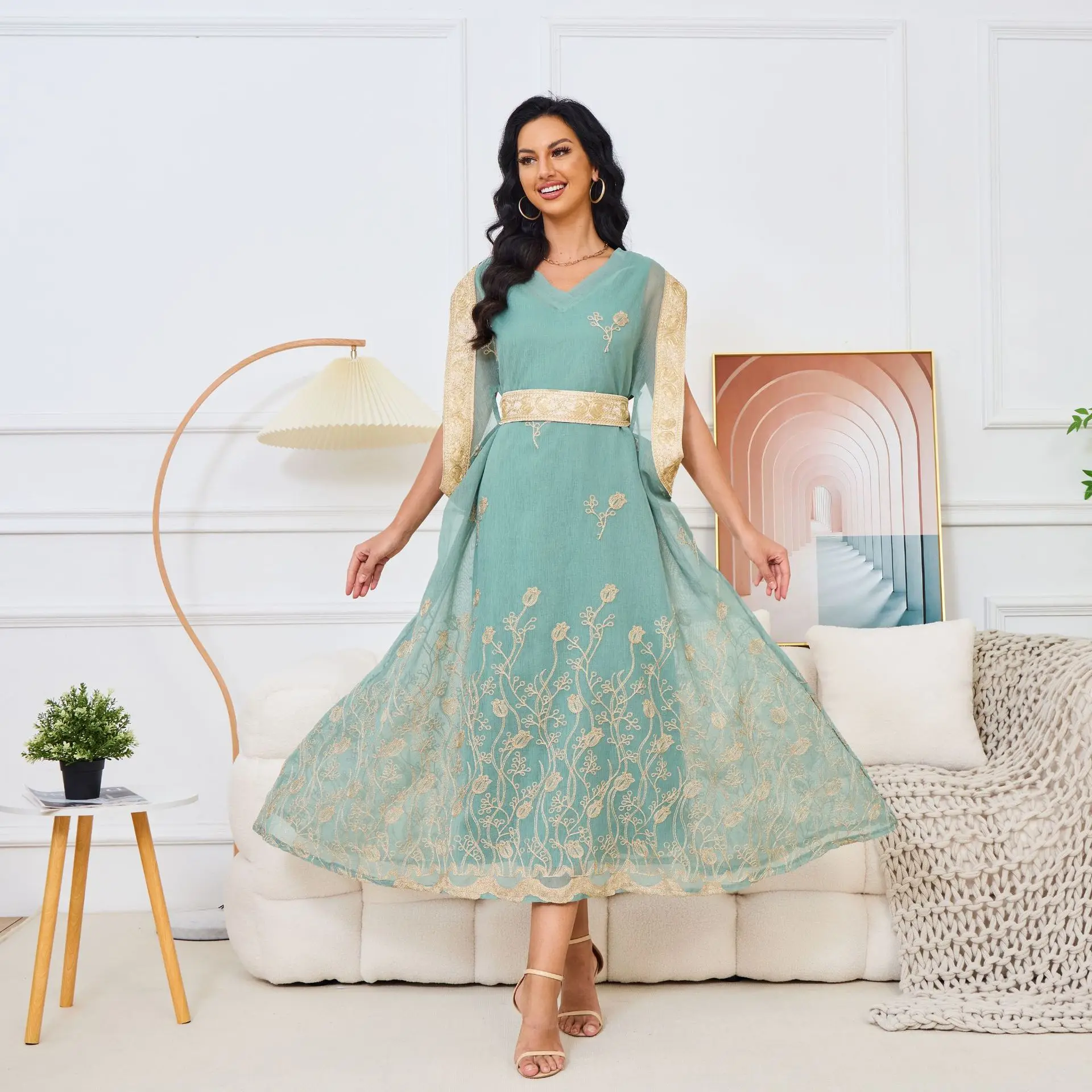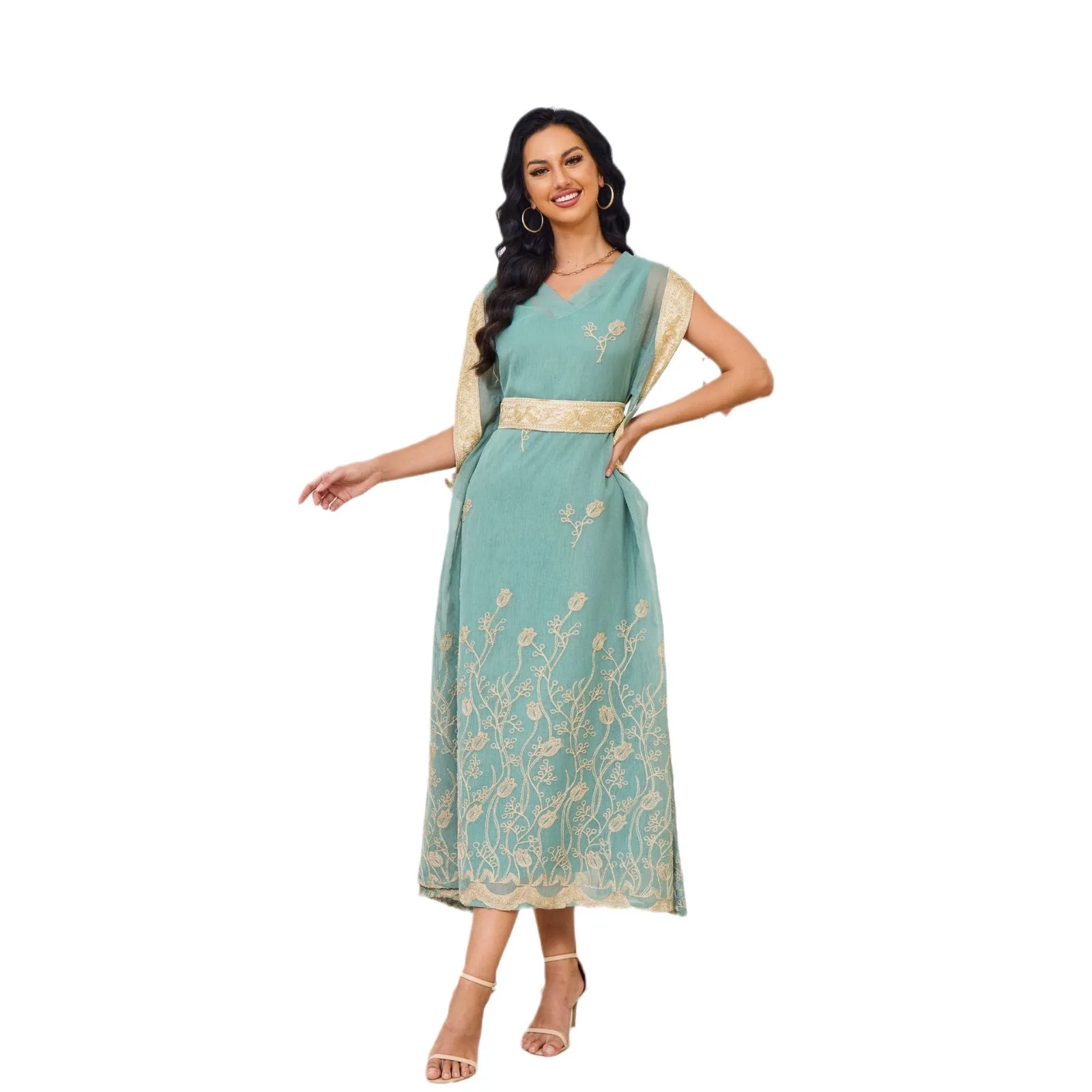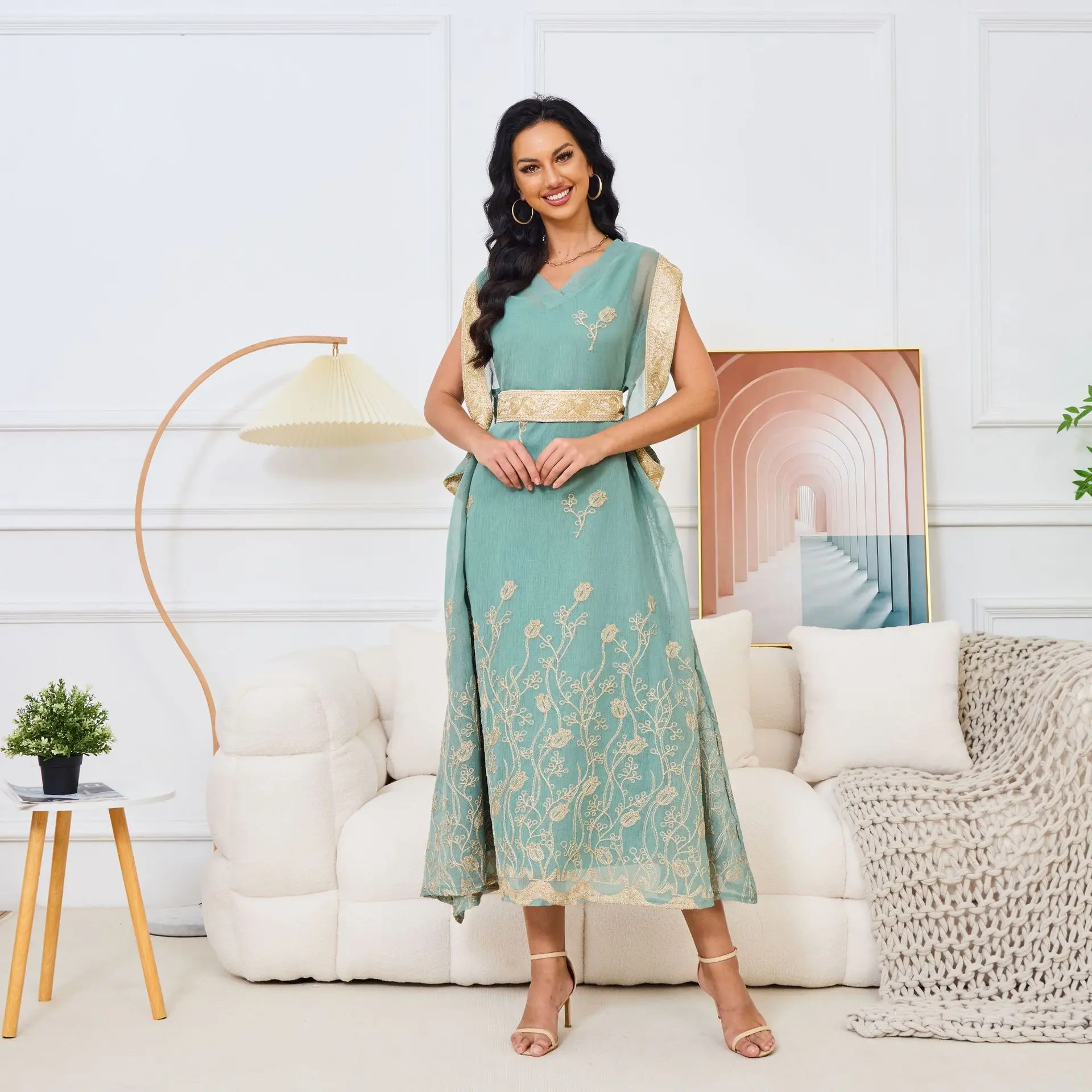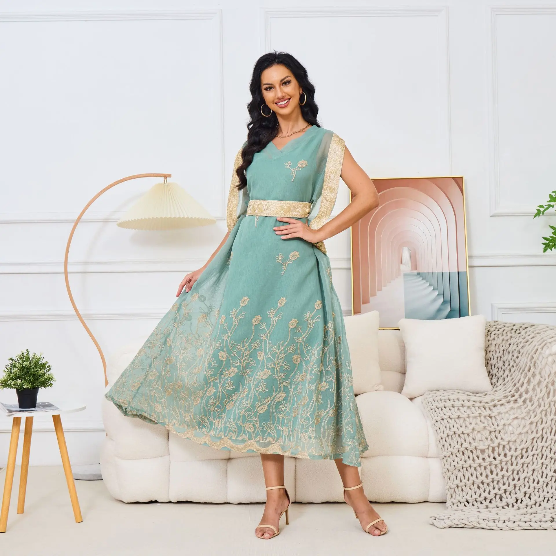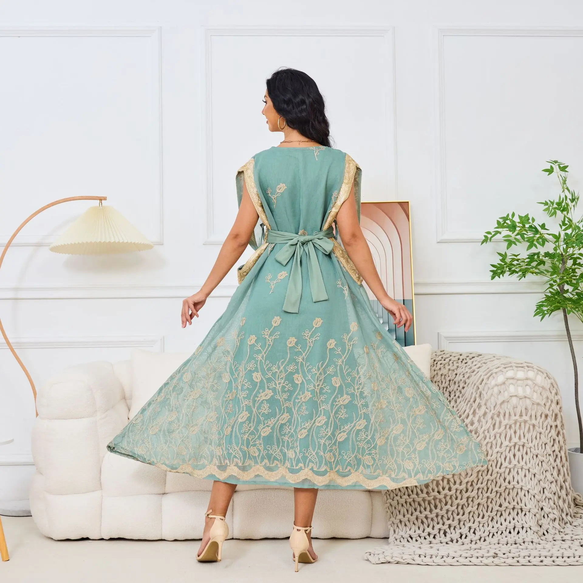 Autumn Cross-Border Elegant Embroidered Gauze Muslim Dress Sleeveless with Large Hem Polyester ABaya for Eid