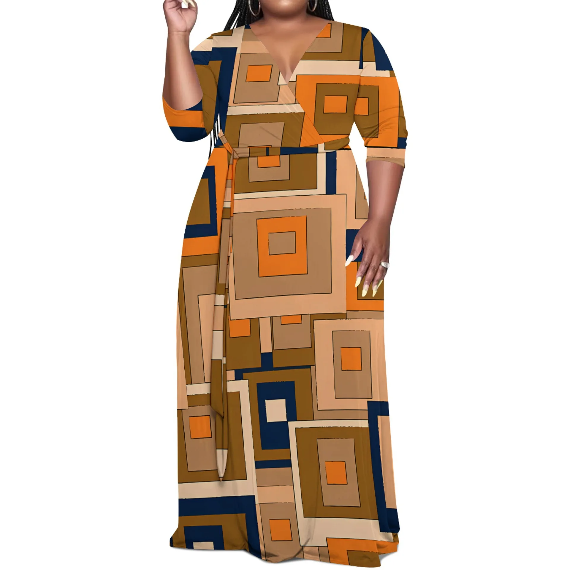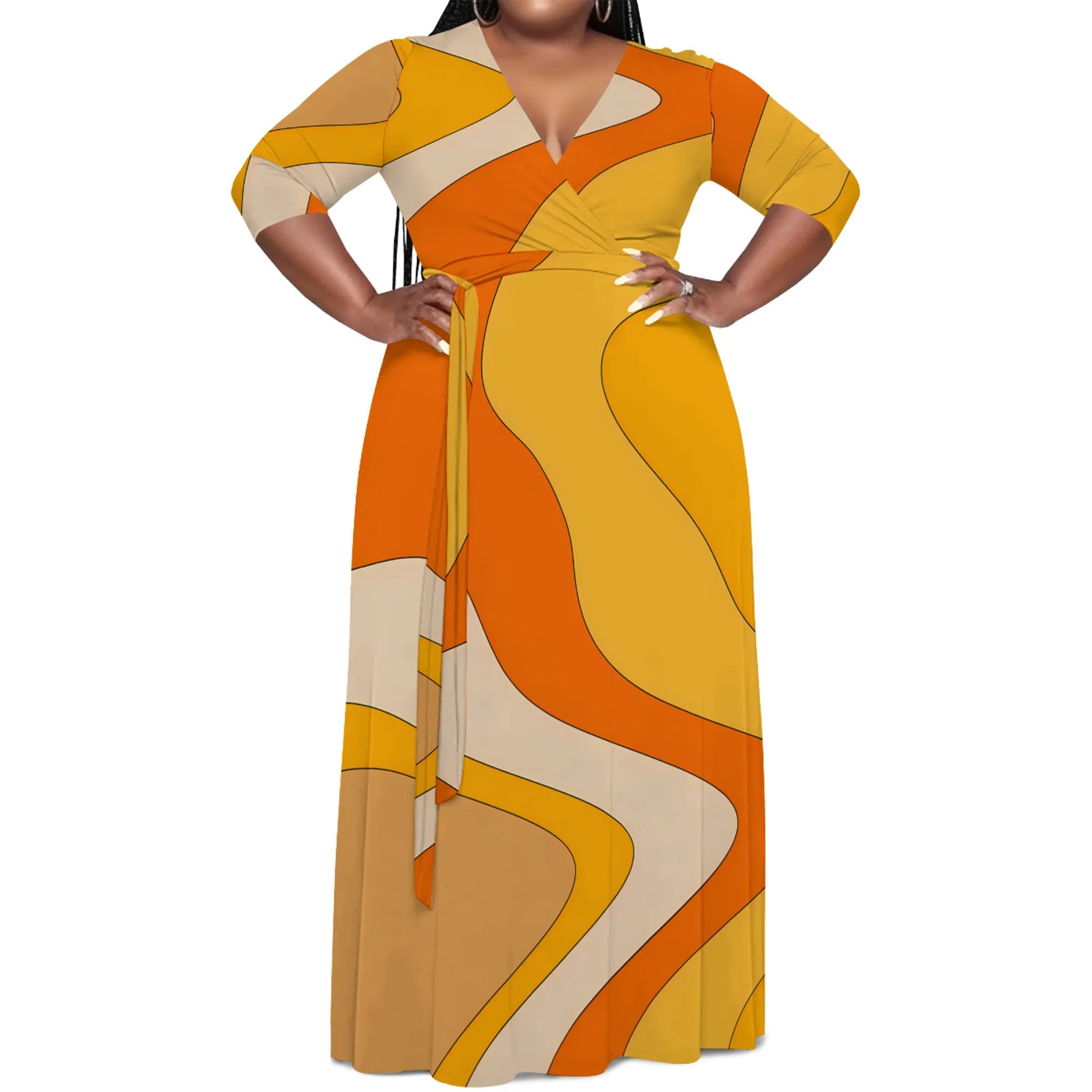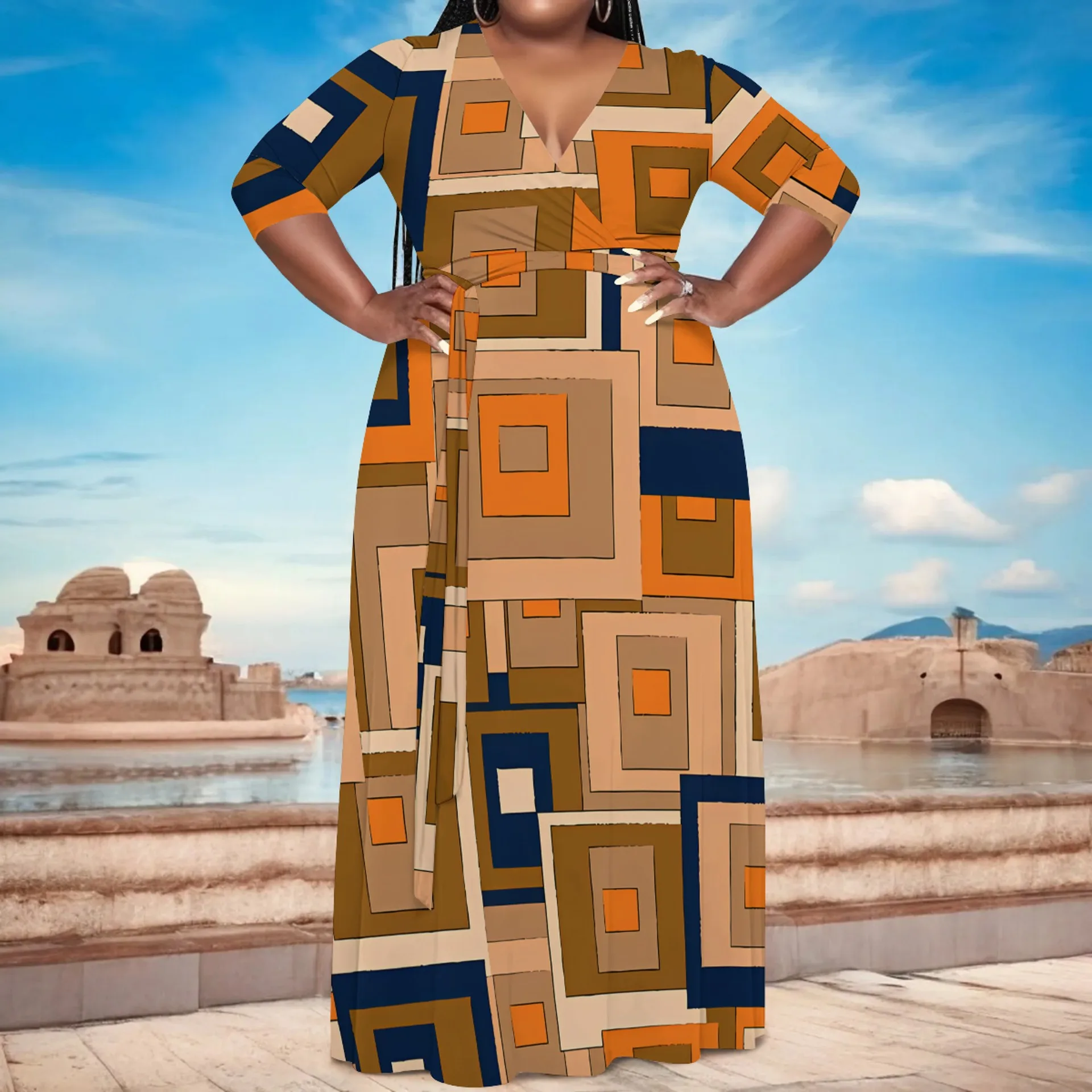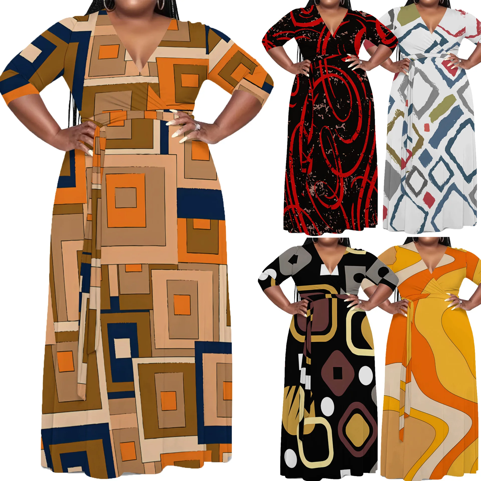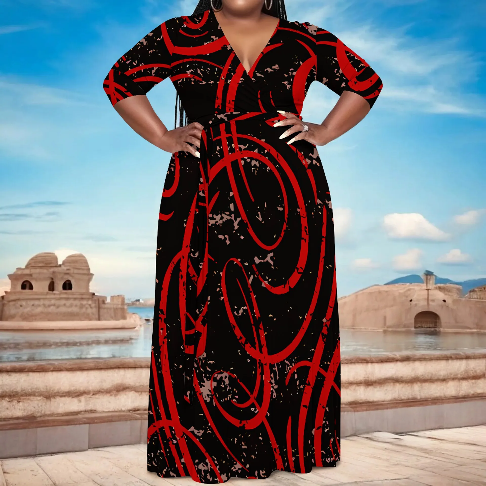 European American Women's Elegant Black Dress Hot Selling Casual Printed Plus Size Summer Empire Waistline Sashes Loose Fit