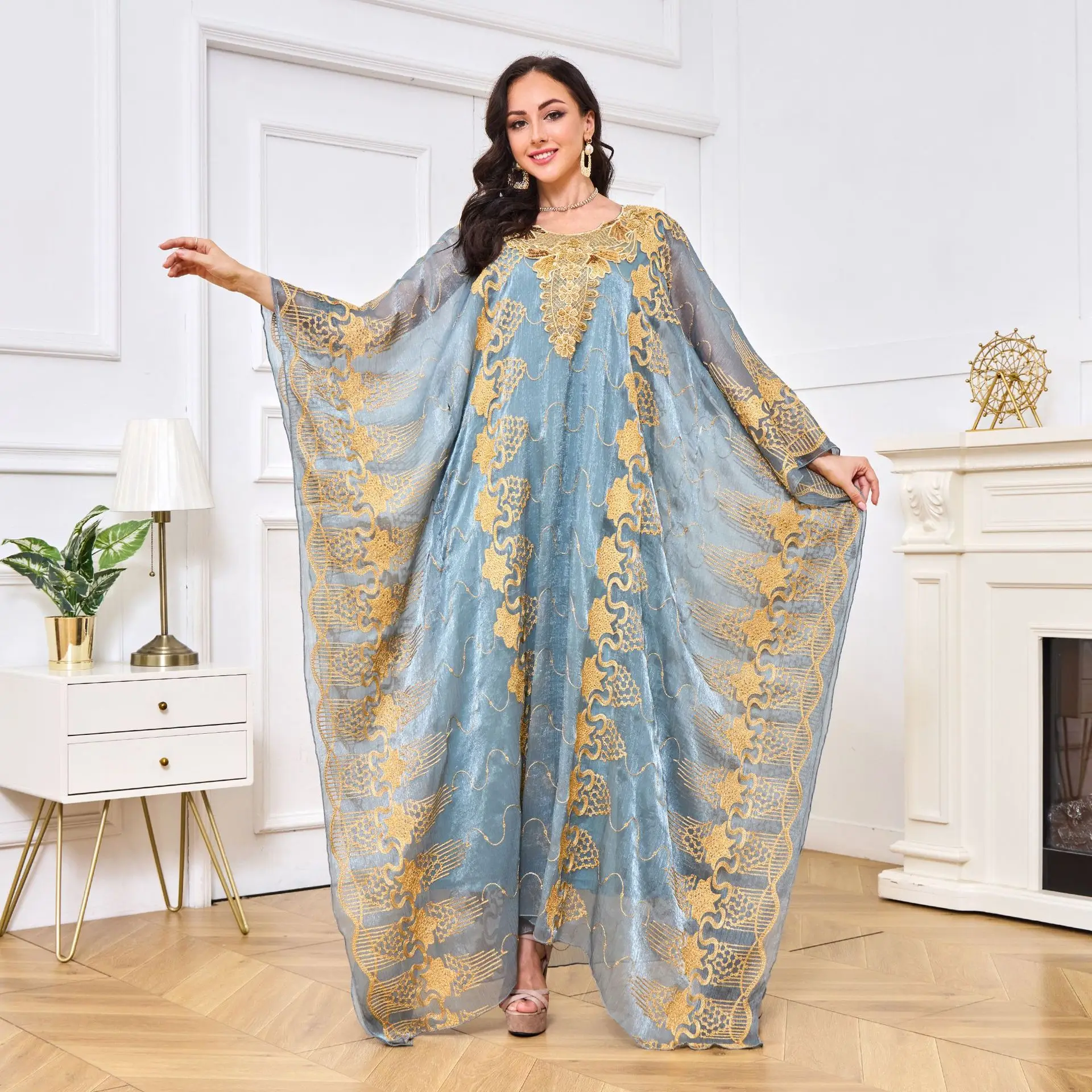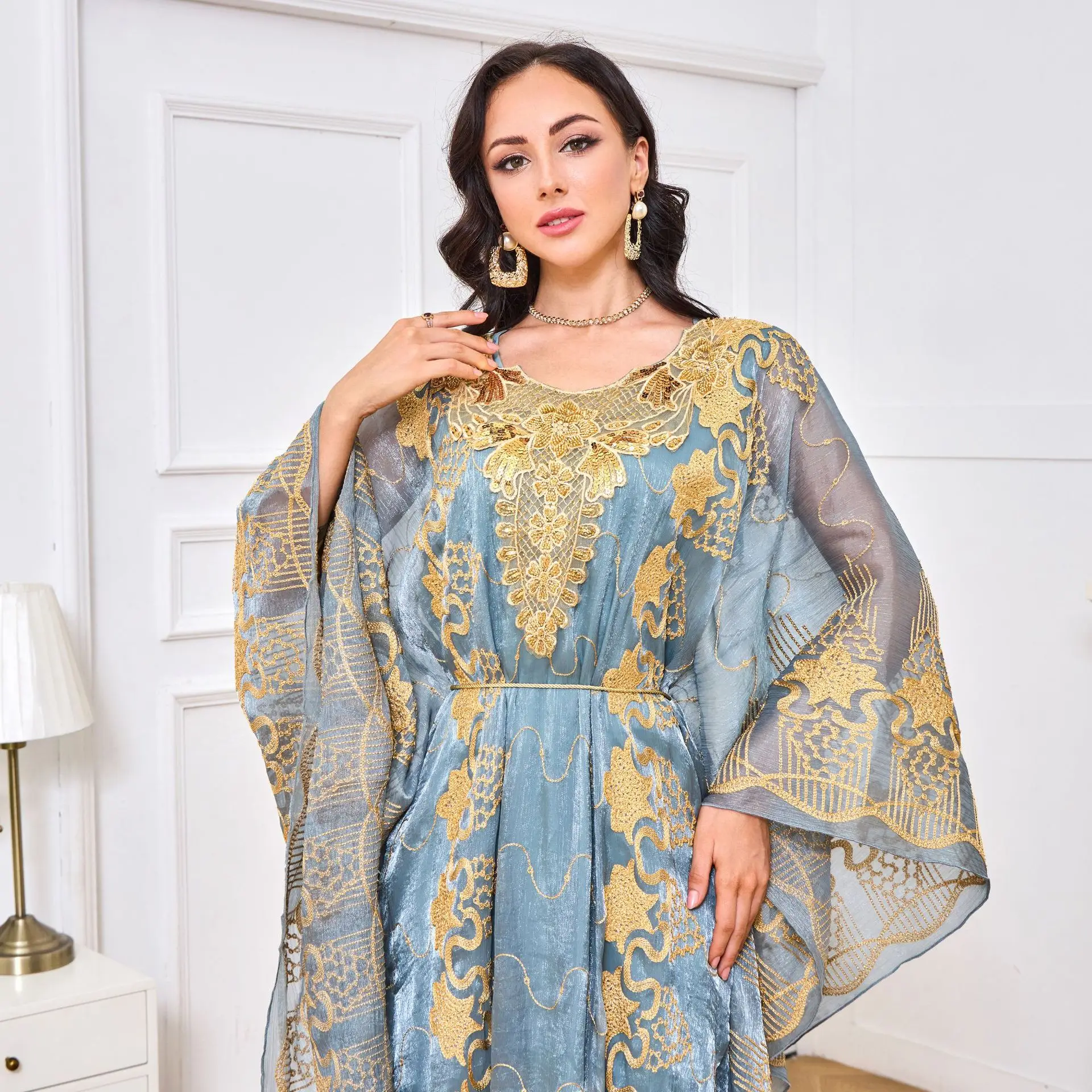 Vintage Moroccan Muslim Two-Piece Evening Set Dress Embroidered Sequin Summer Abaya Cross-Border Trade Polyester for Middle East