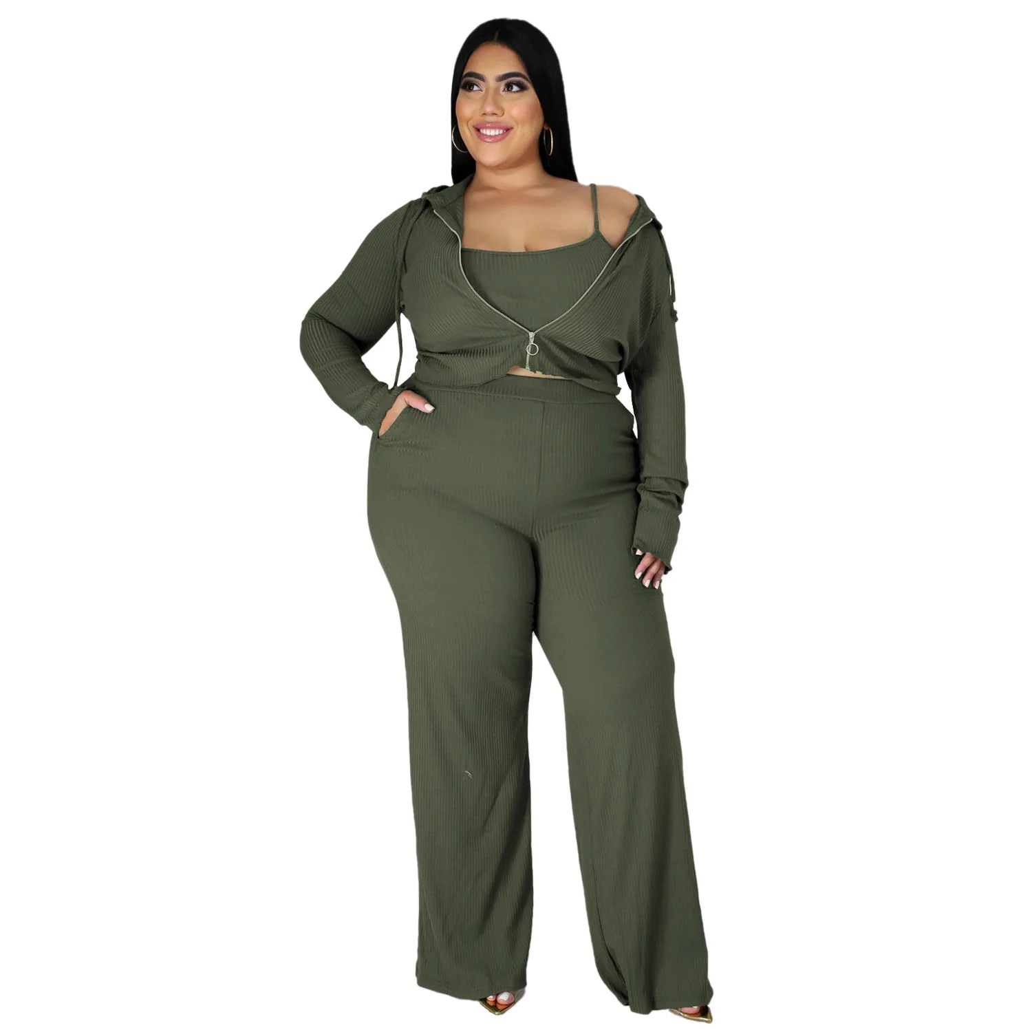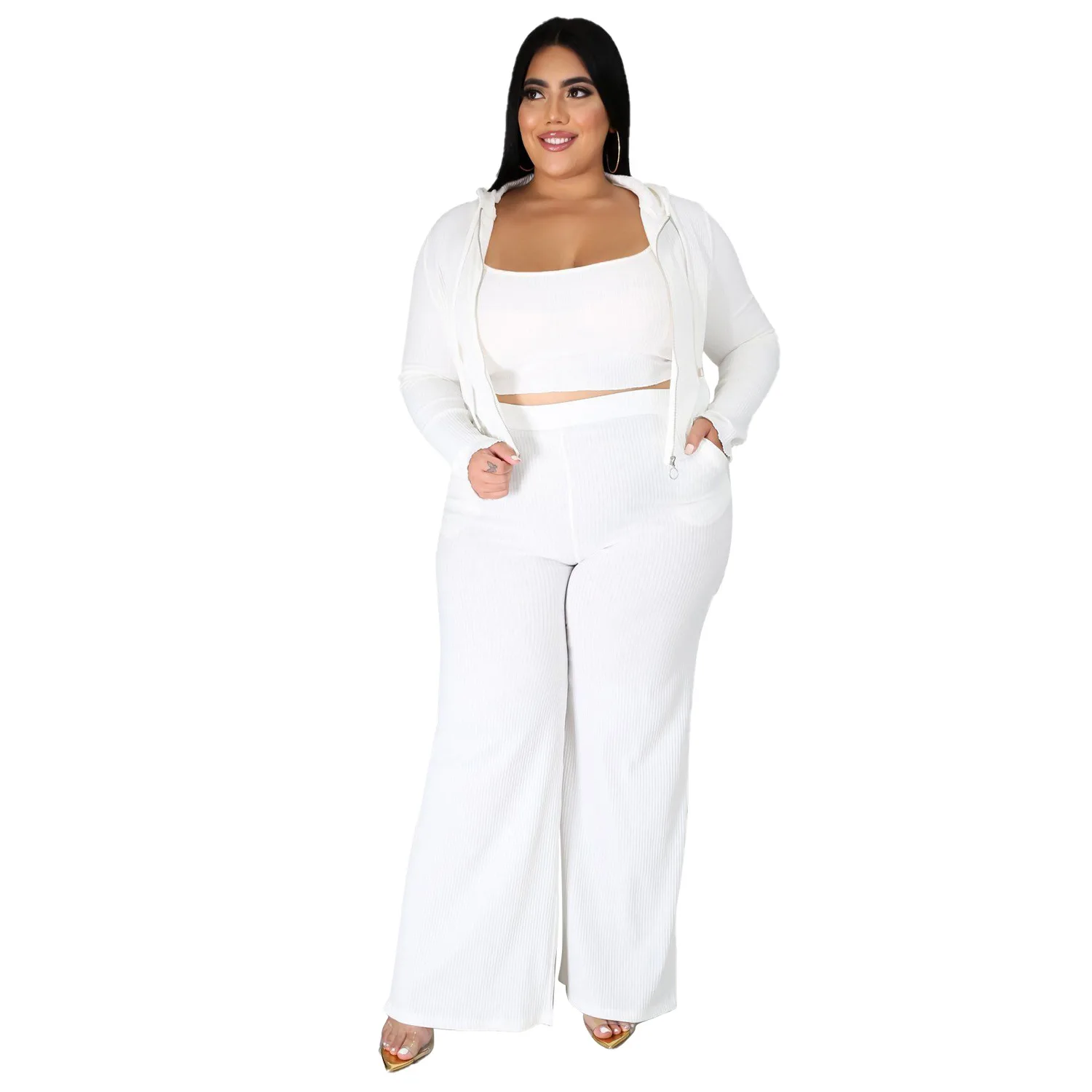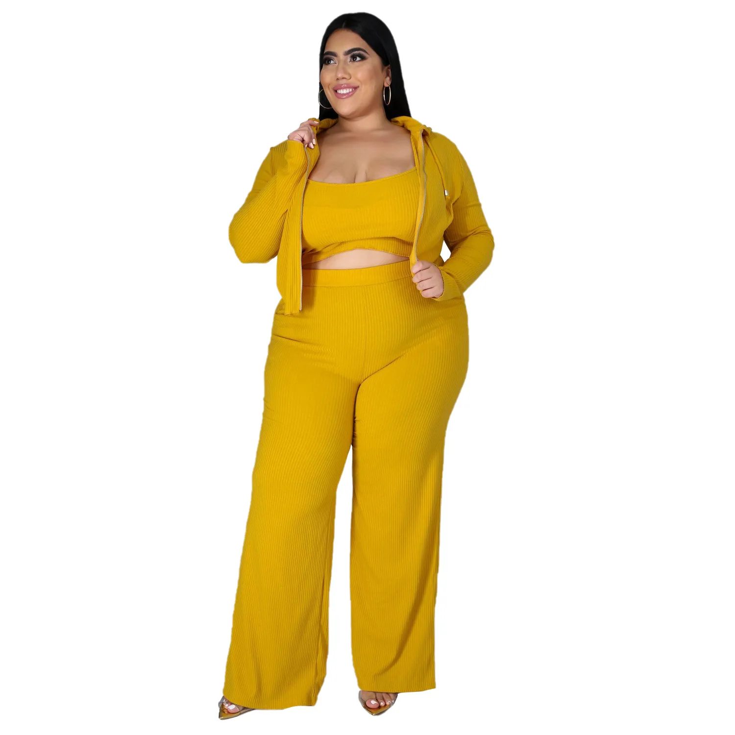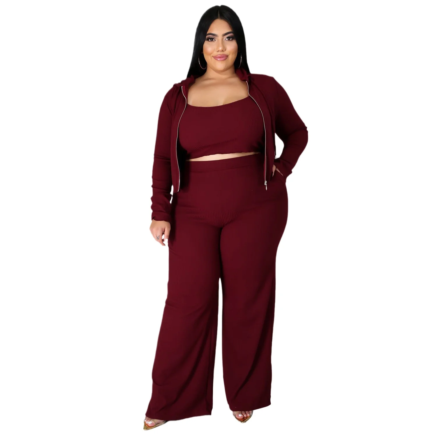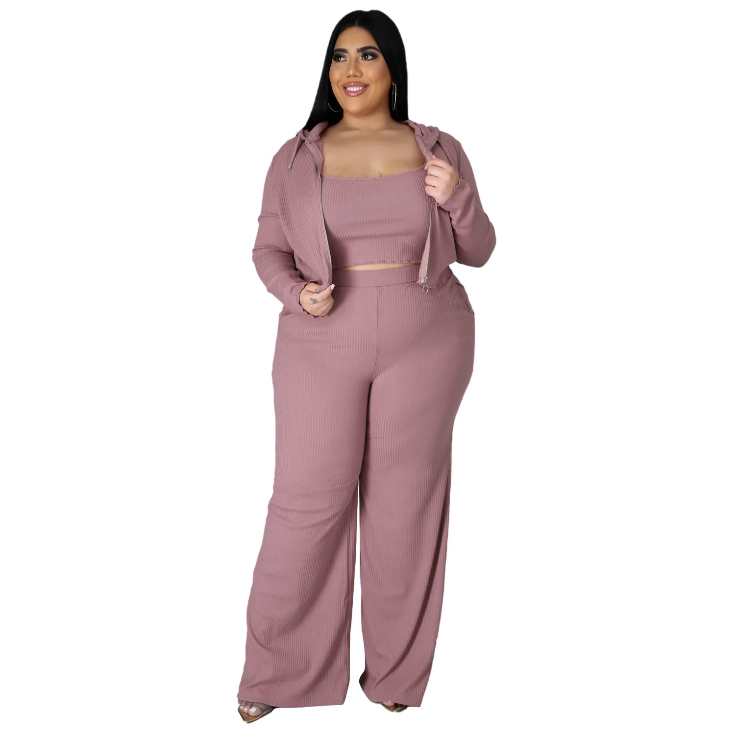 Women's Graceful Three-Piece Sports and Leisure Set Sunken Stripe Sweatshirt Tube Top and Wide Leg Pants Fashionable Plus Size
