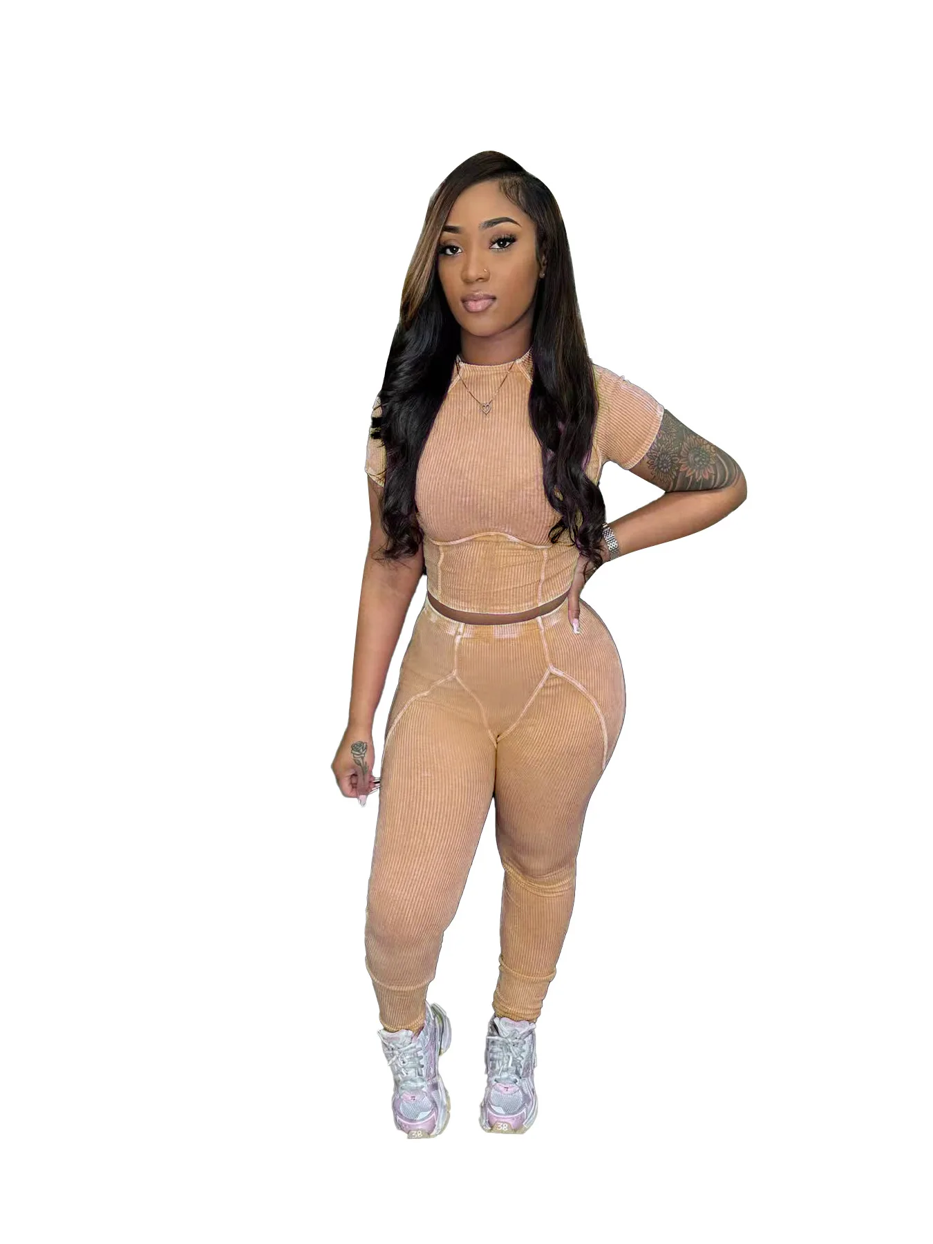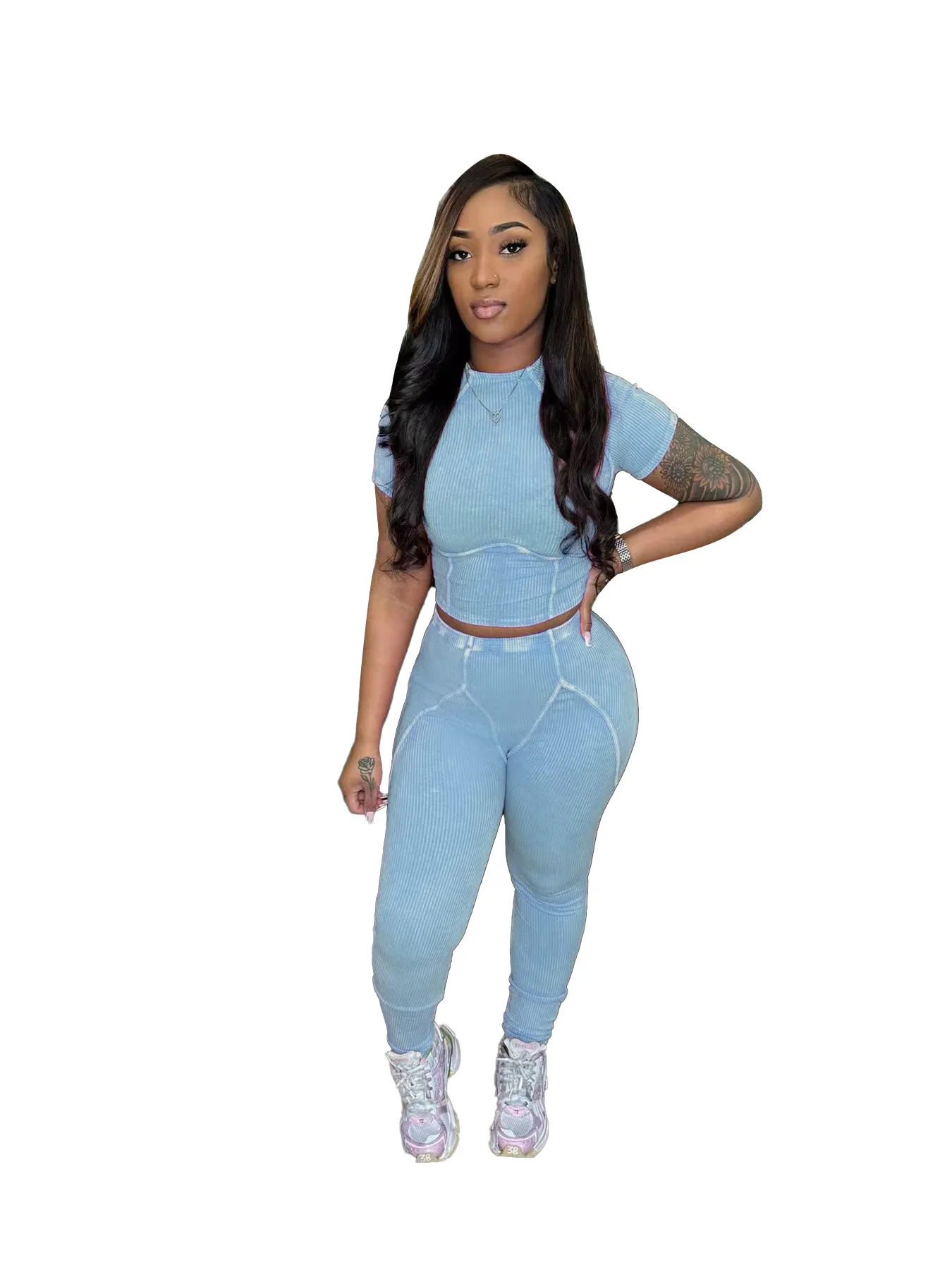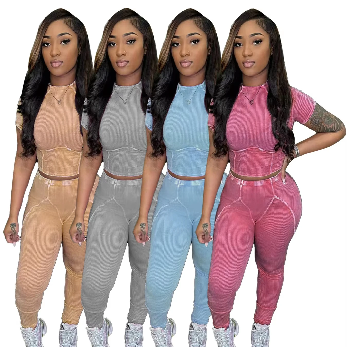 Custom Logo Women Summer 2 Piece Set Short Sleeve O Neck Crop Top Long Pants Women Washed Casual Set