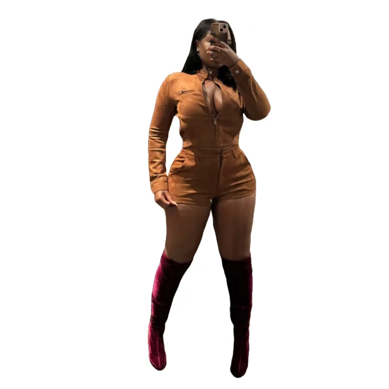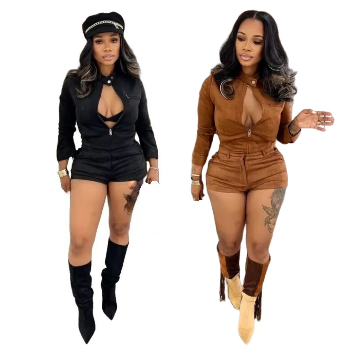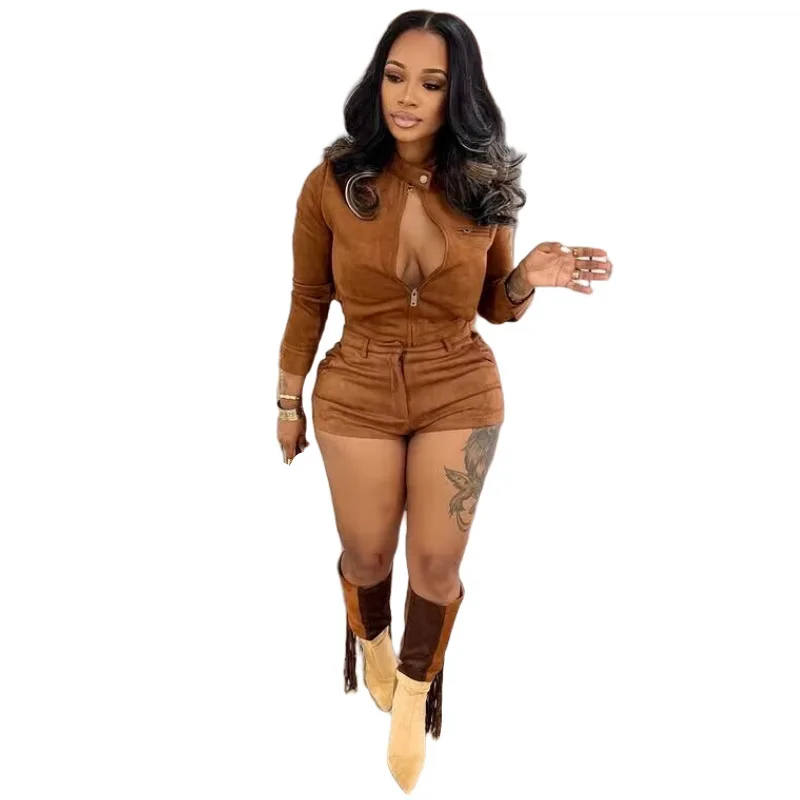 New Arrival Women Long Sleeve Stand Collar Crop Top Solid Color Sexy Shorts Women Casual Two Pieces Short Set