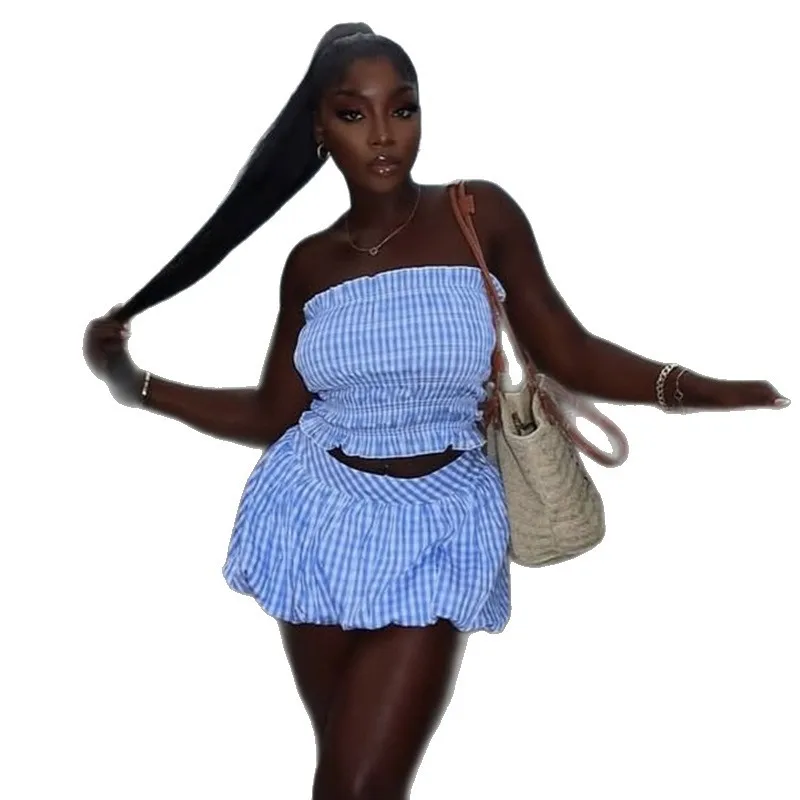 Summer Hot Sale Women Strapless Fashion Print Casual Two Piece Set Tube Crop Top Mini Skirt Women Sexy Set