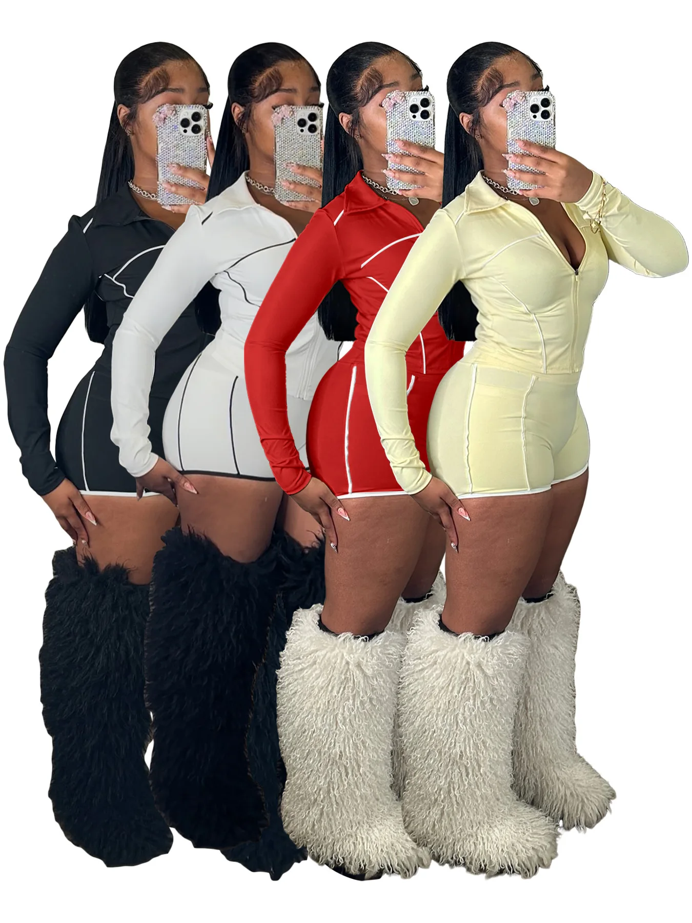 Women Sportswear Two Piece Set Long Sleeve Turndown Neck Crop Top Sports Shorts Women Two Piece Short Set