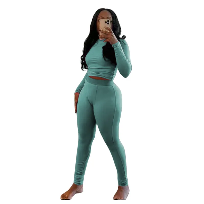 Autumn Winter Women 2 Pieces Pant Set Women Outfits Solid Knitted Lounge Long Sleeve Crop Top High Waist Stretch Casual Set