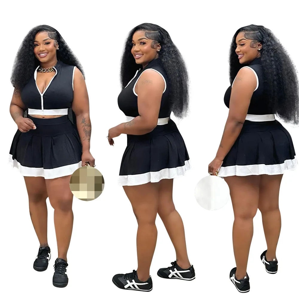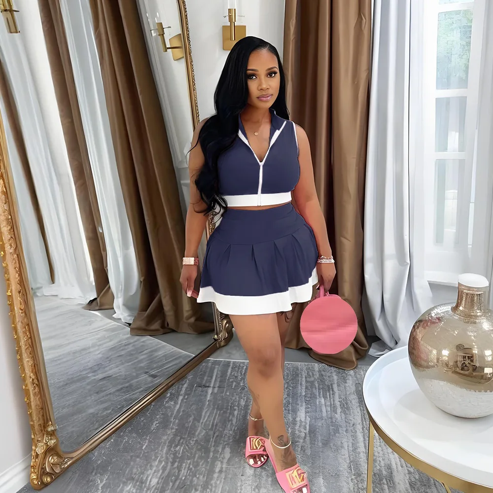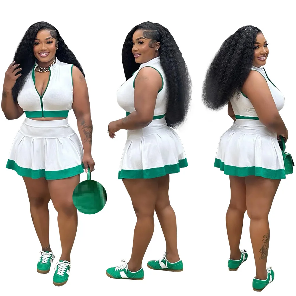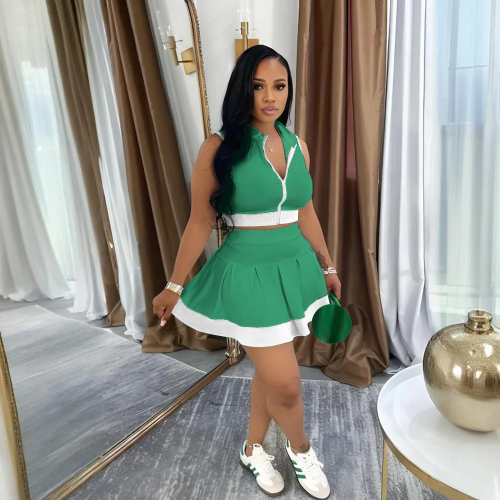 Custom Logo Summer Patchwork Color Sleeveless Crop Top Two Piece Pleated Skirt Set Women Sexy Two Piece Set