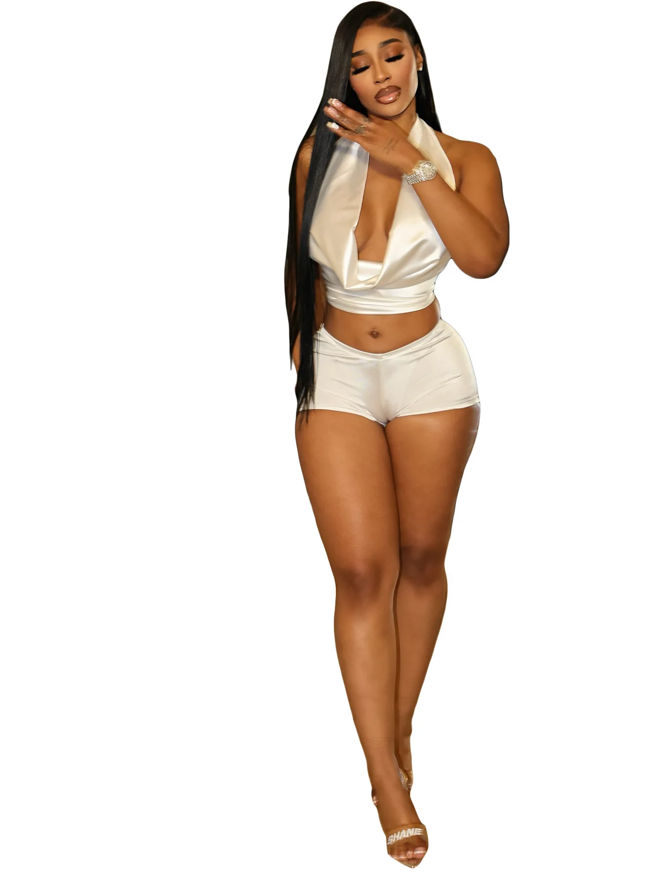 Summer Hot Sale Women Sleeveless Deep V Neck Crop Top Backless Halter Vest 2 Piece Short Outfit Set Women Two Piece Set