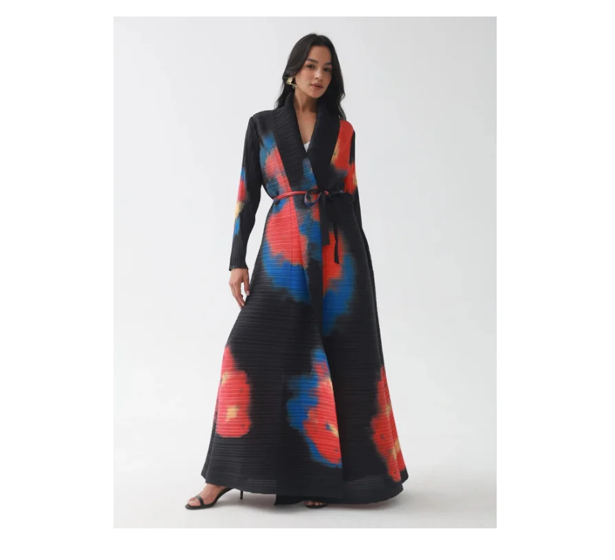 Factory Customized High Quality Miyake Pleated Abaya Scarf Collar Belt Kaftan Robes Front Open Coat Women Muslim Modest Abaya