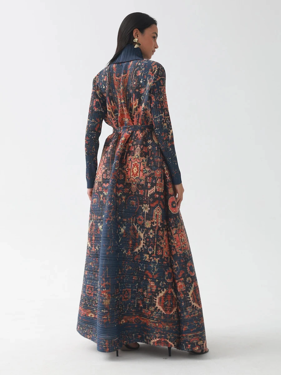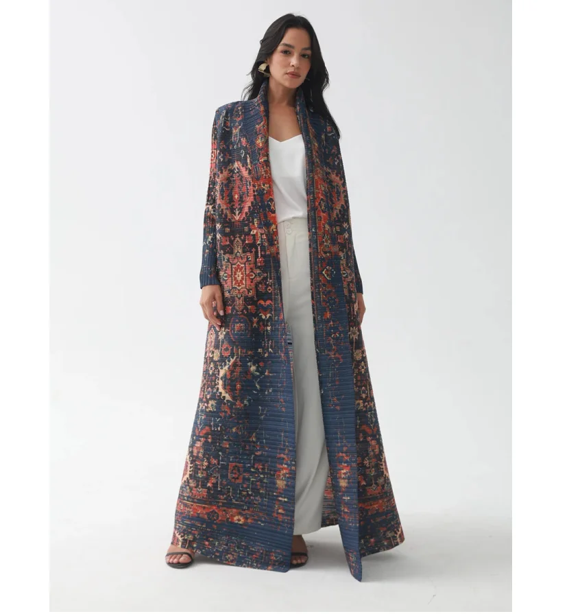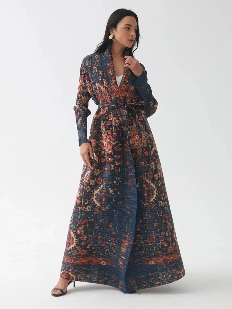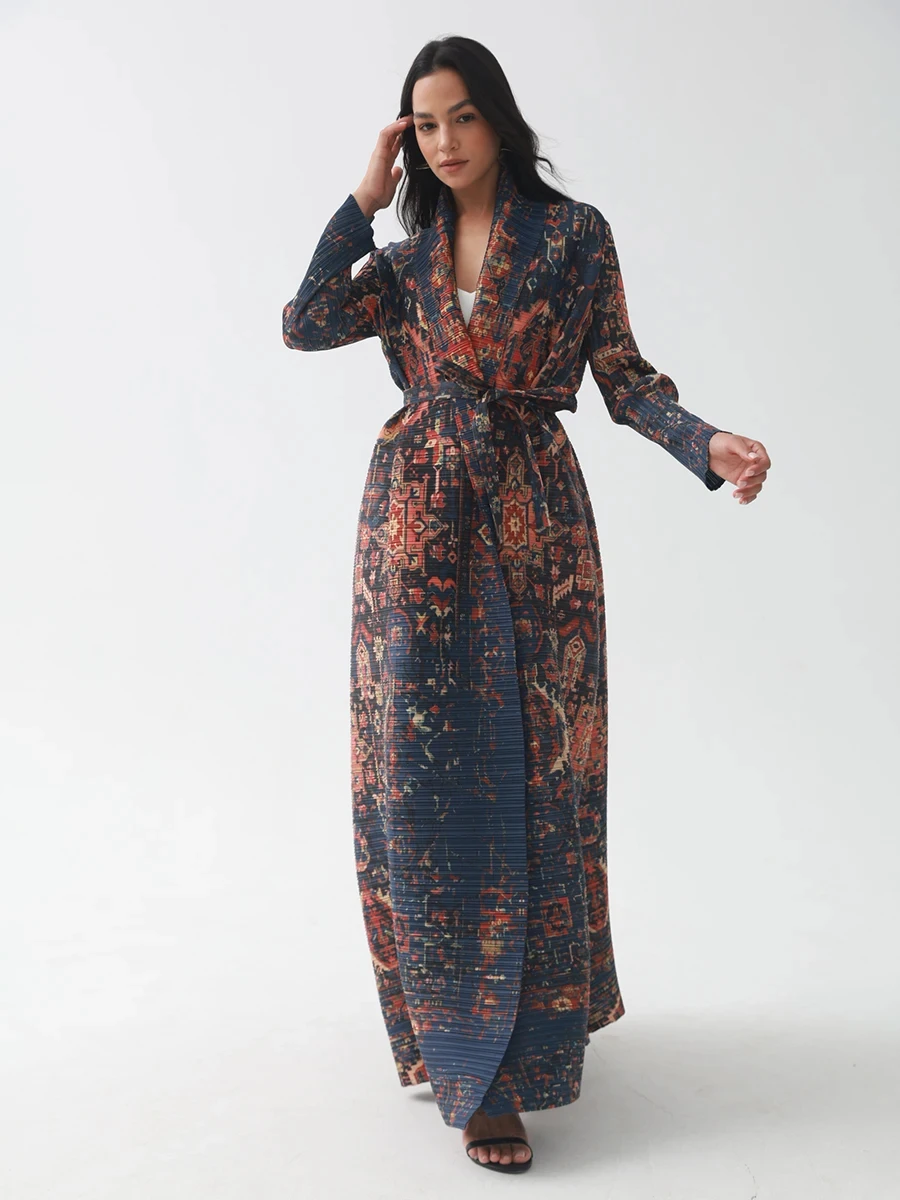 OEM High Quality Miyake Pleated Abaya Scarf Collar Belt Kaftan Robes Front Open Coat Women Muslim Modest Abaya