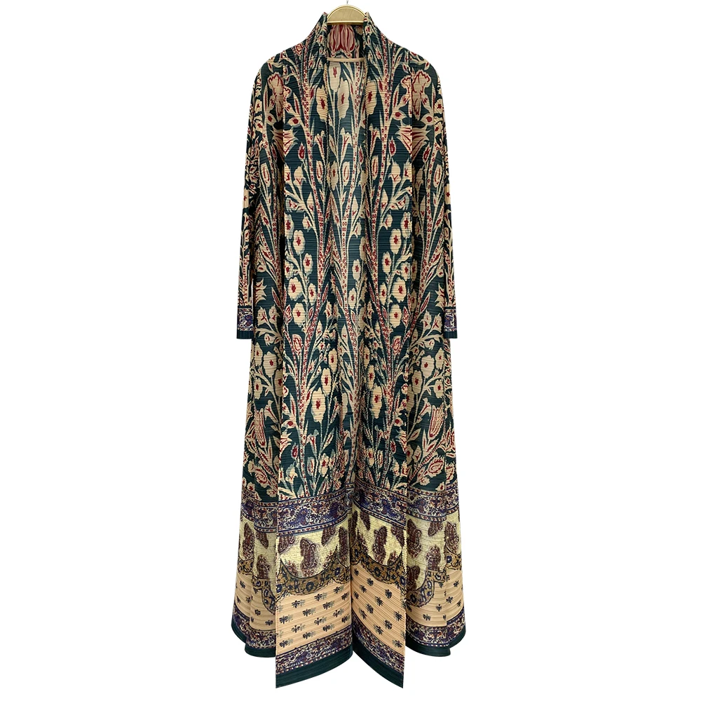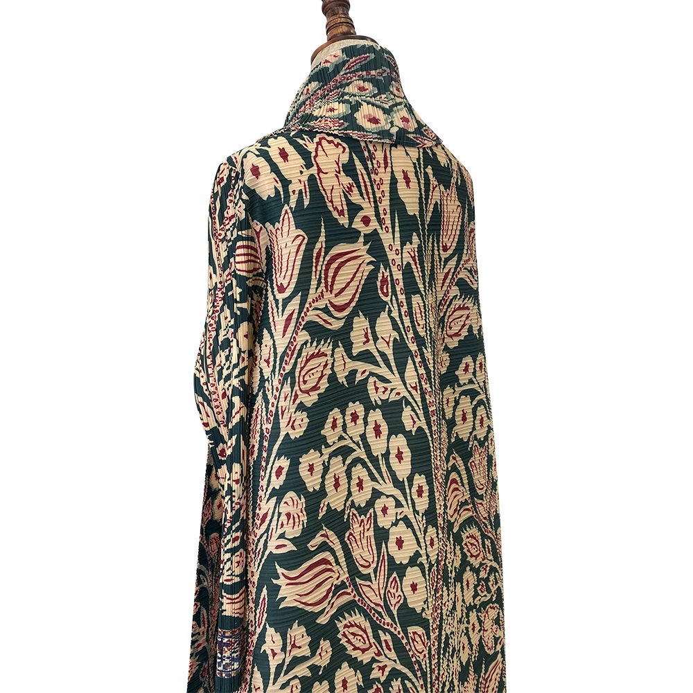 Miyake Flower Pleated Turndown Collar Vintage Mid East Long Sleeve Dress Women New Print Design Abaya Fashion Long Loose Coat