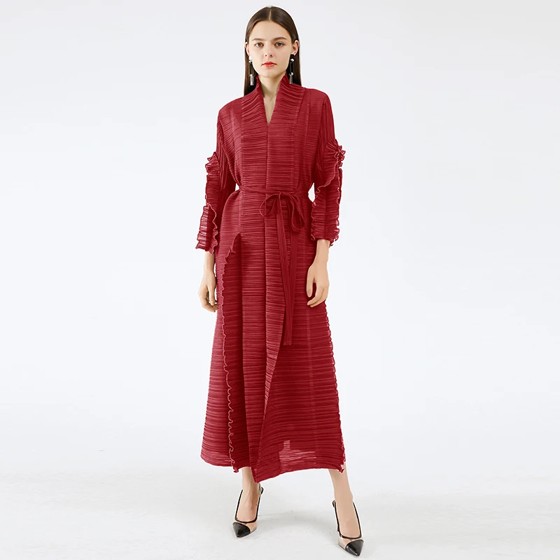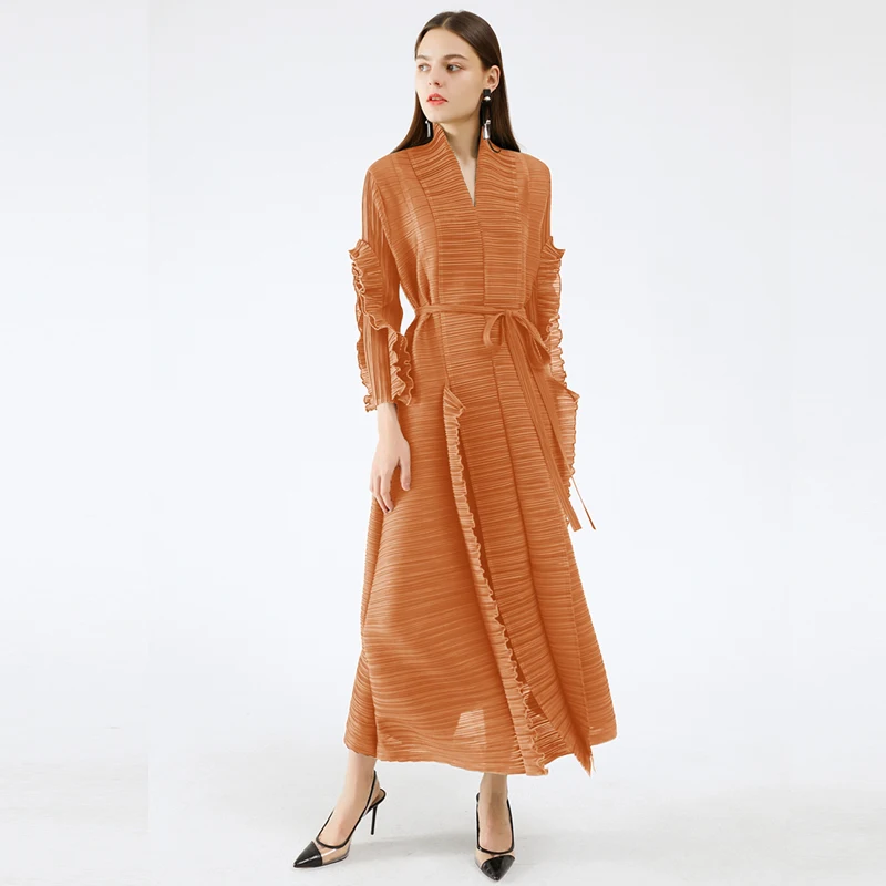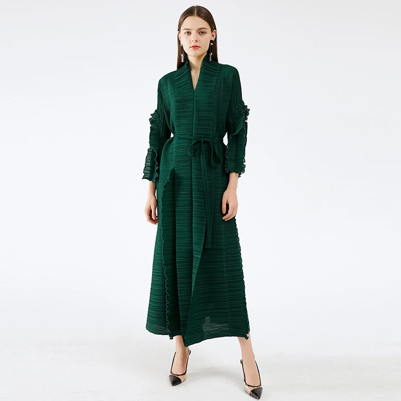 Miyake Pleated Long Petal Sleeve Dress Lapel Cardigan Sashes Plus Size High Long Green Dress 2021 Women Aesthetic Clothes
