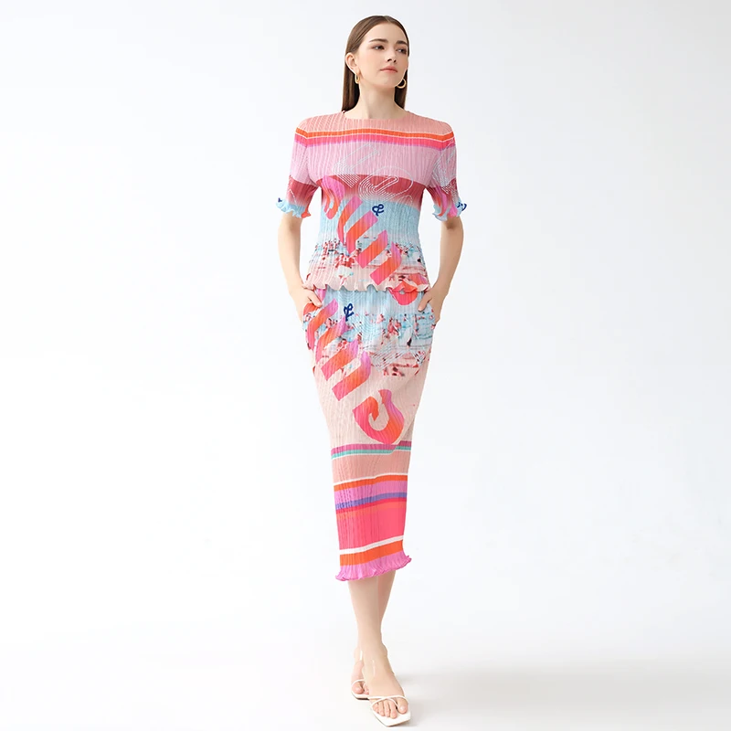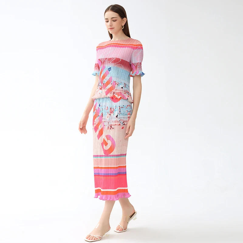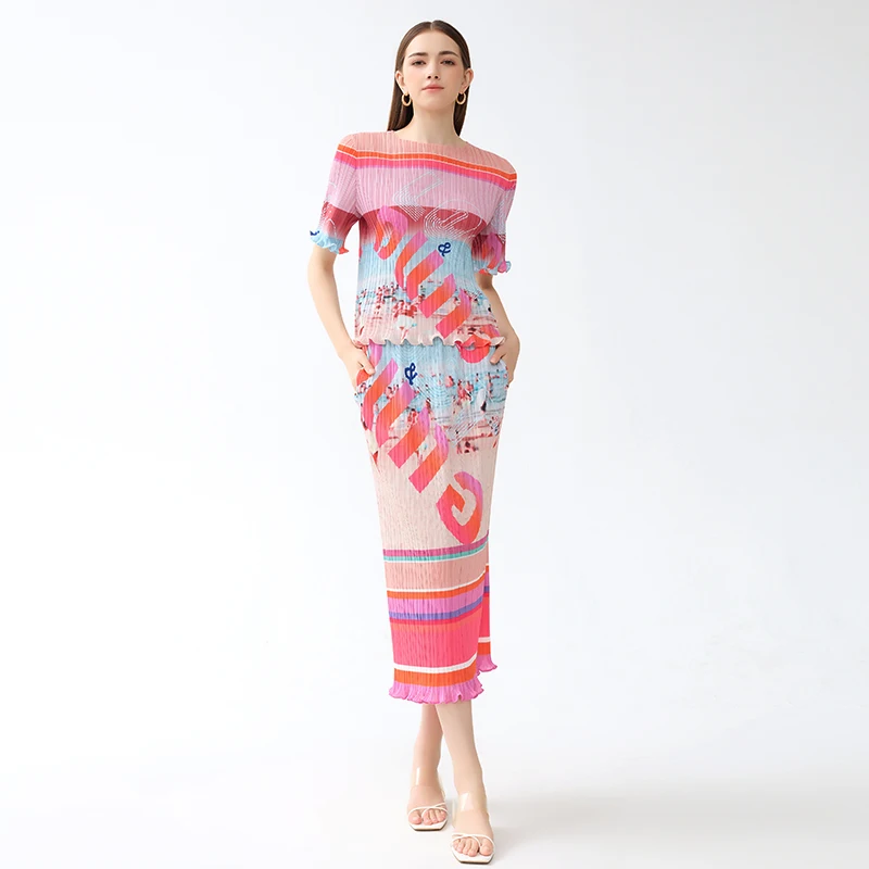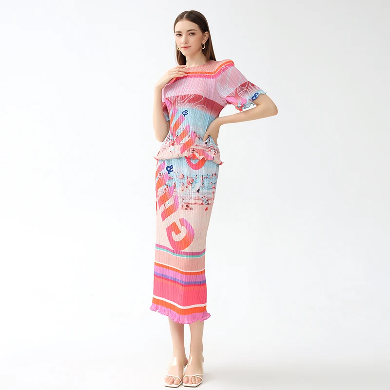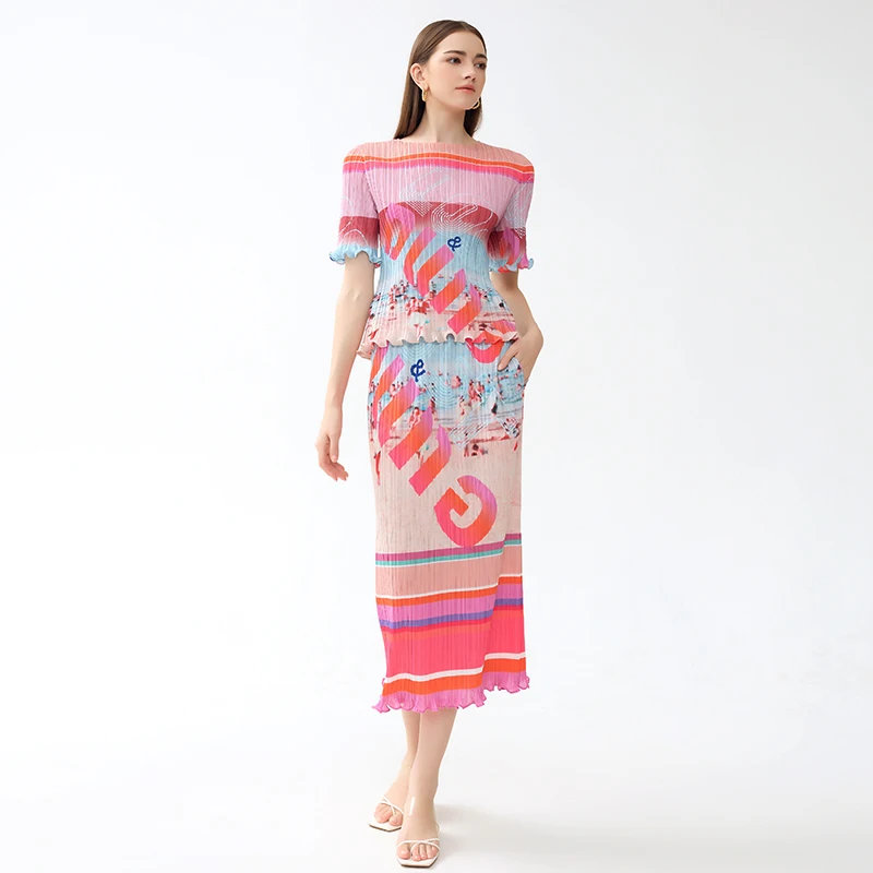 Factory Customized Miyake Two Pieces Girls Floral Print Letter Pleated Skirts Ruffled Hem Casual Women Wear