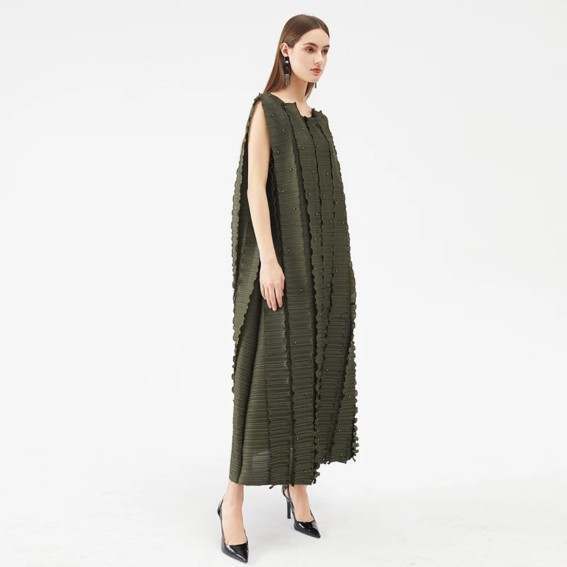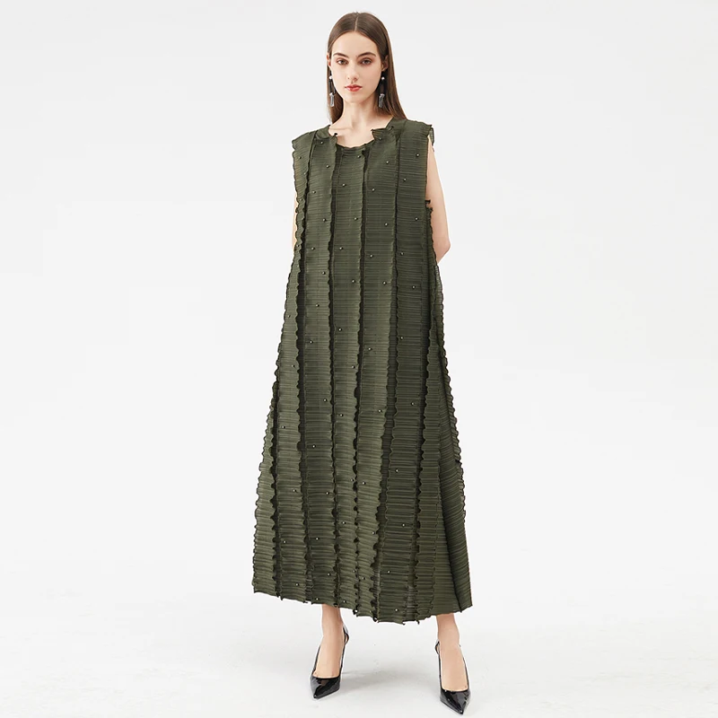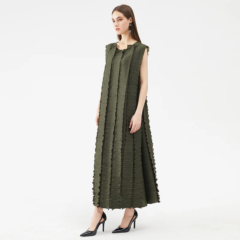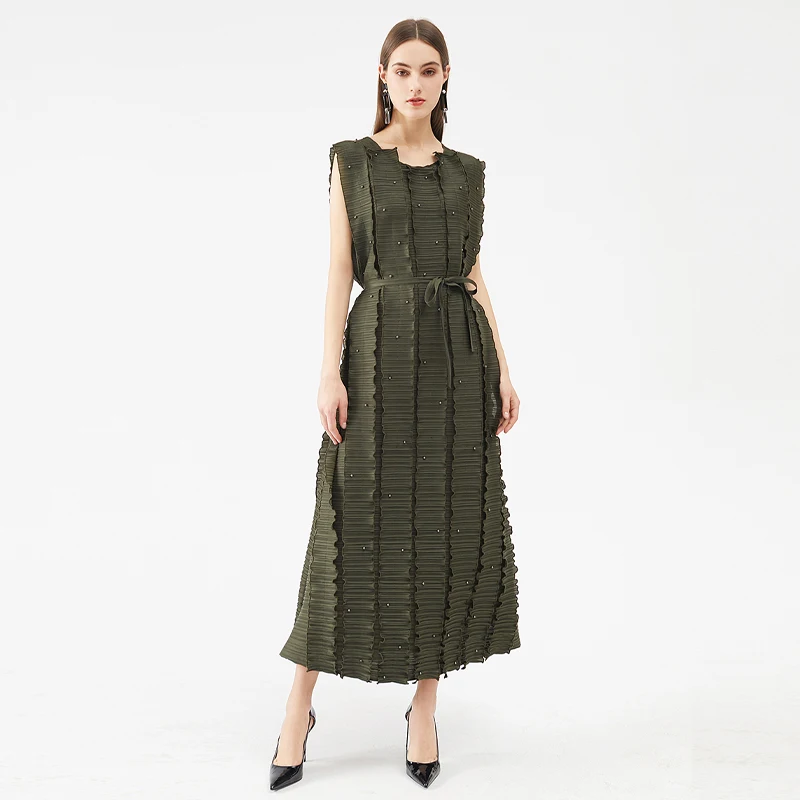 Factory Wholesale New Hot Selling Robe Designer Style Set Bead Pleated Long Black Army Green Dress