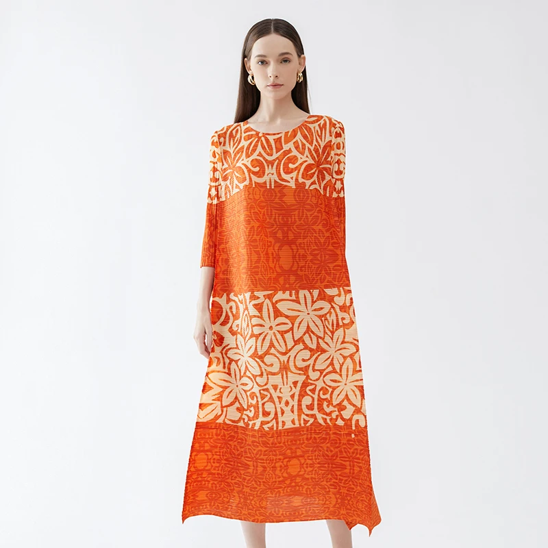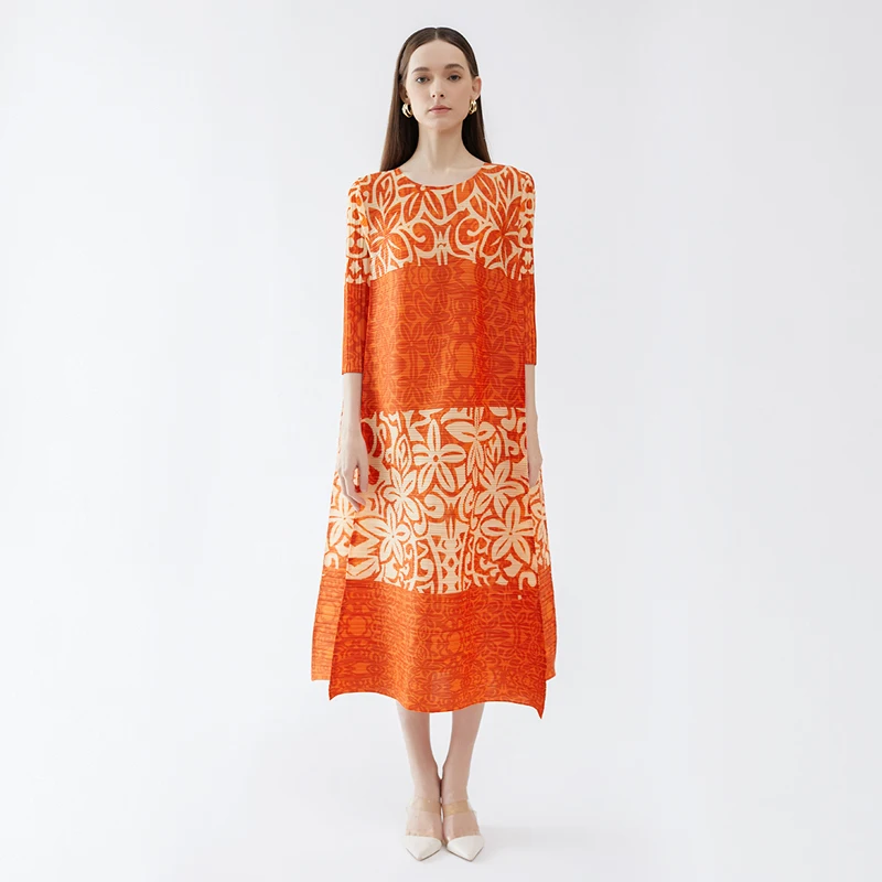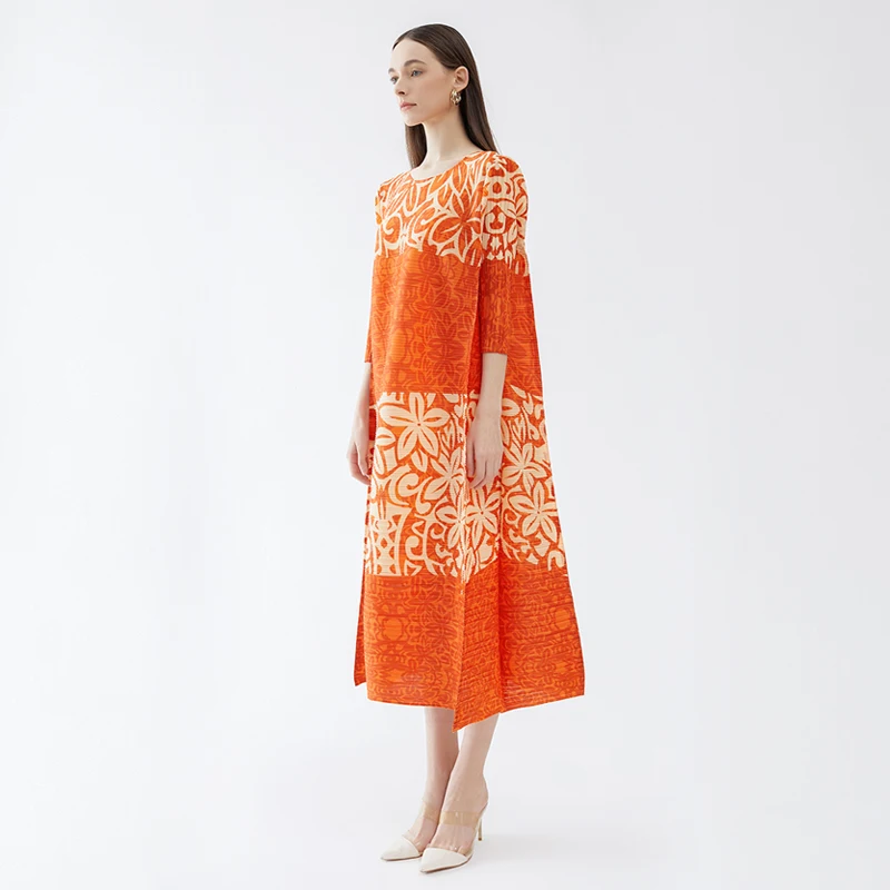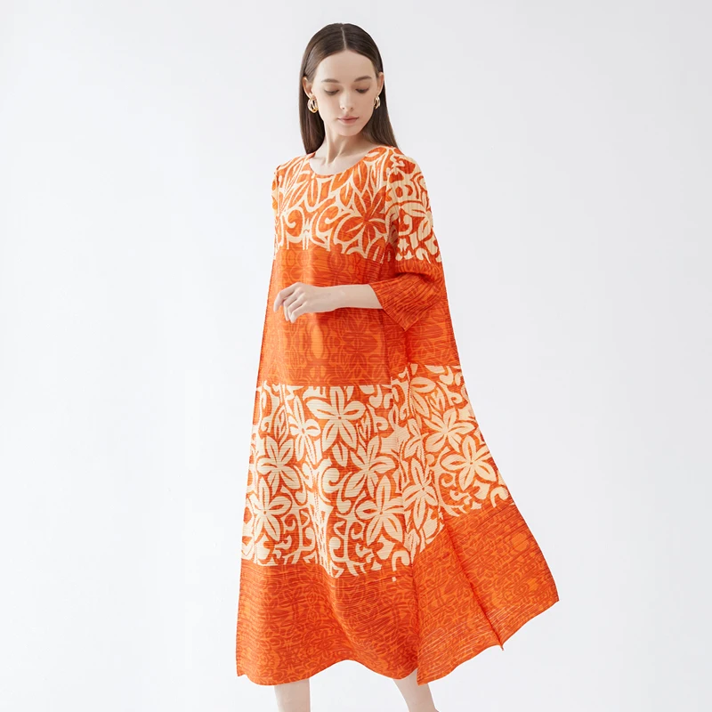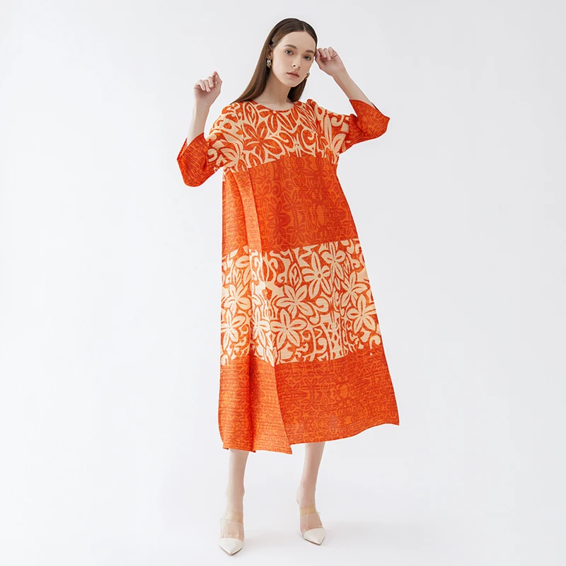 High Quality Spring New Designer Aesthetic Clothing Printing Pleats Fashion Fashion Loose Size Round Neck Dress Women