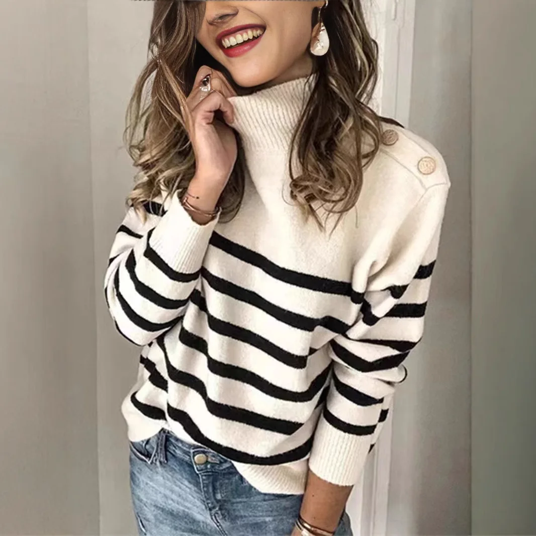 Autumn Winter Women's Stylish Korean-Style High-Neck Pullover Shoulder Strap Buttoned Stripes New Collection Knitwear Front Logo