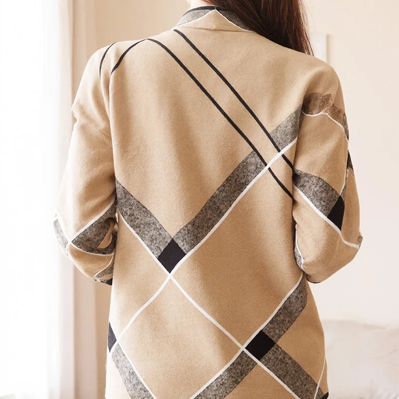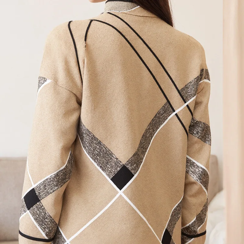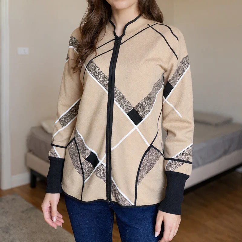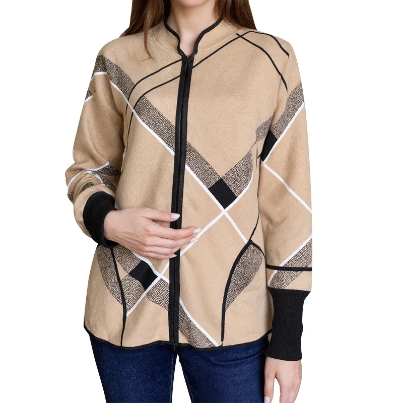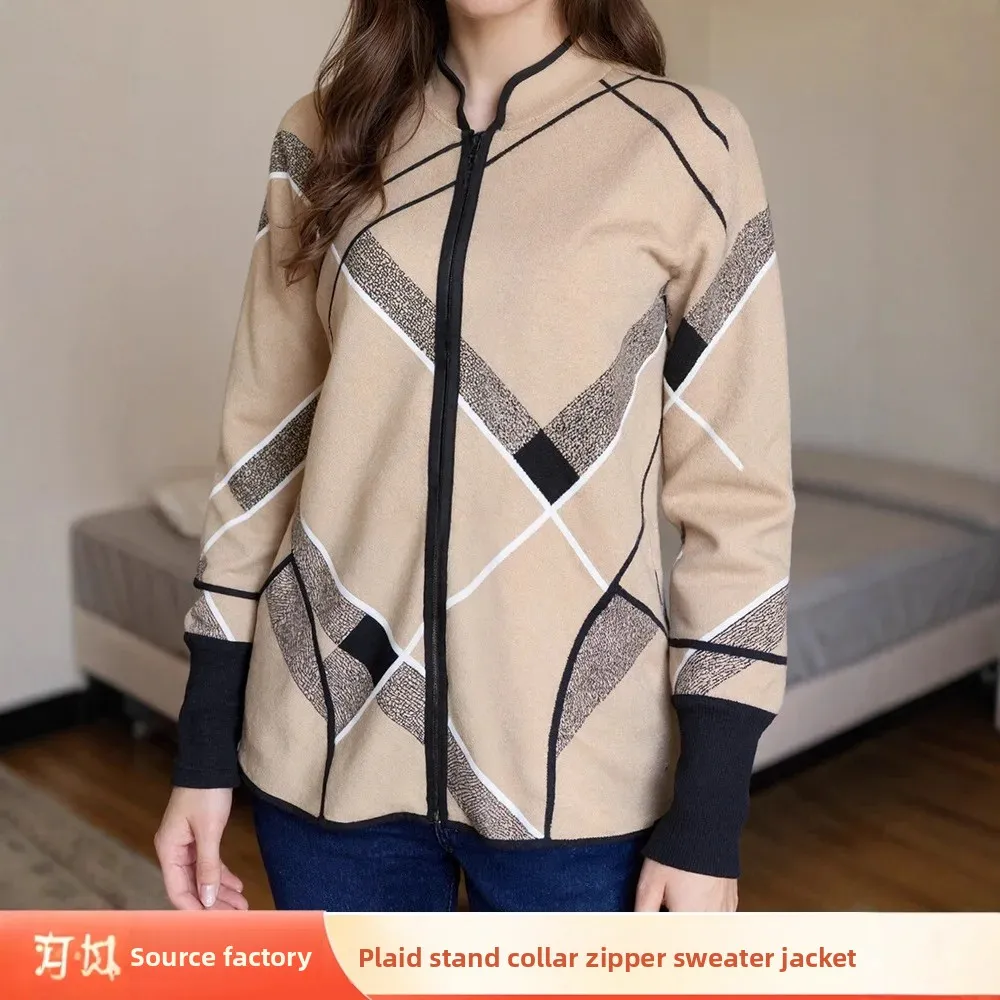 Women's Trendy Plaid Long Coat with Zipper Spring Autumn New Style Breathable Loose Sweater Polyester Lining