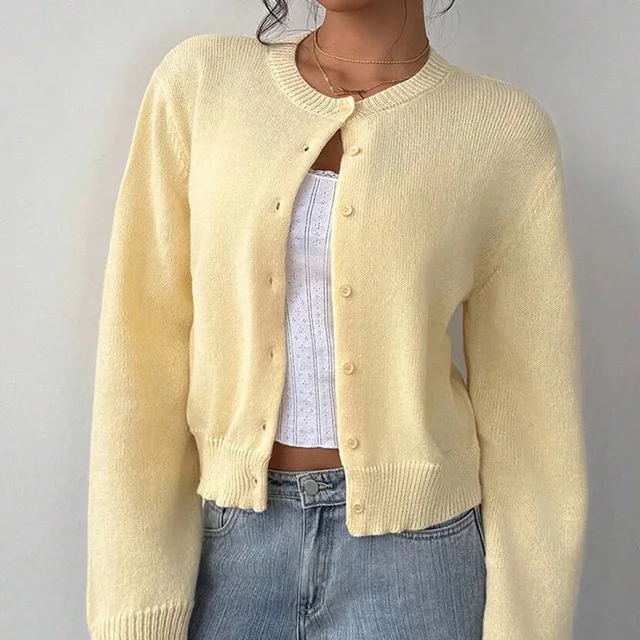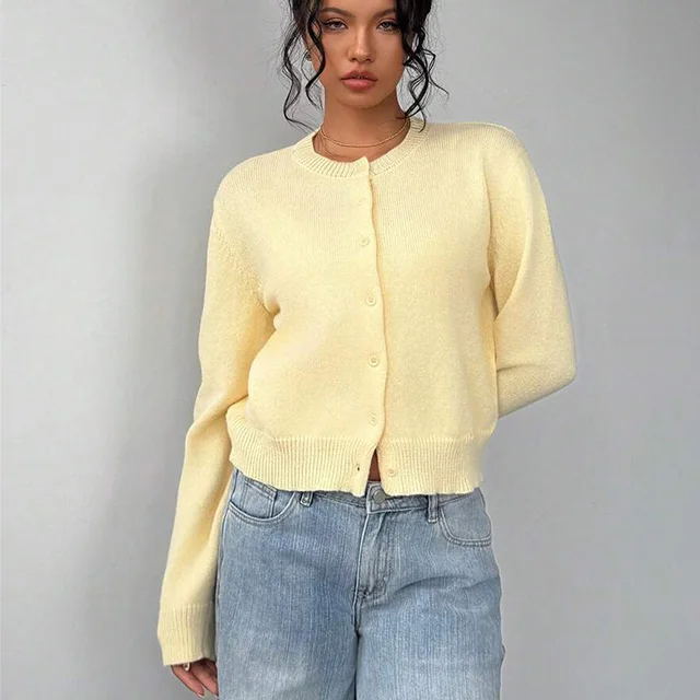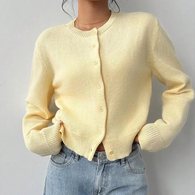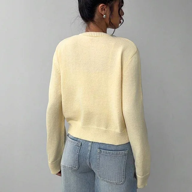 Korean Style Cream Yellow Knitted Shirt/Blouse Women's V-neck 100% Polyester Anti-Pilling Casual Top Button Spring Autumn