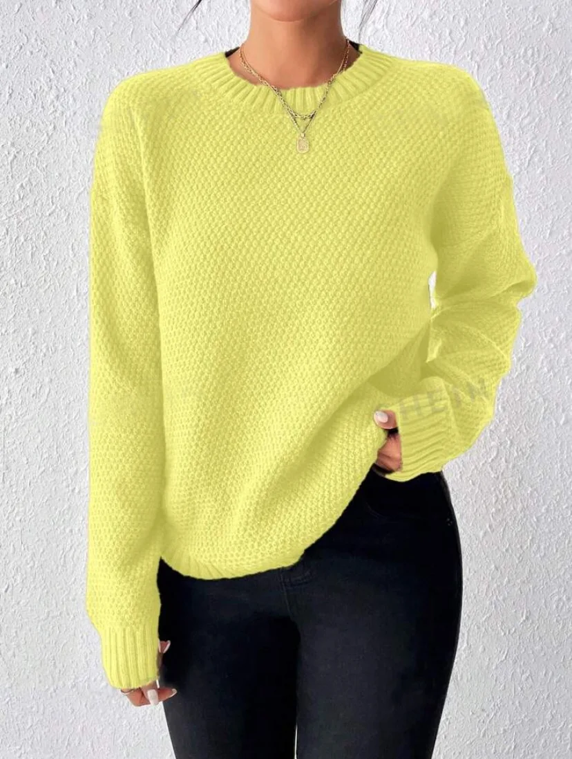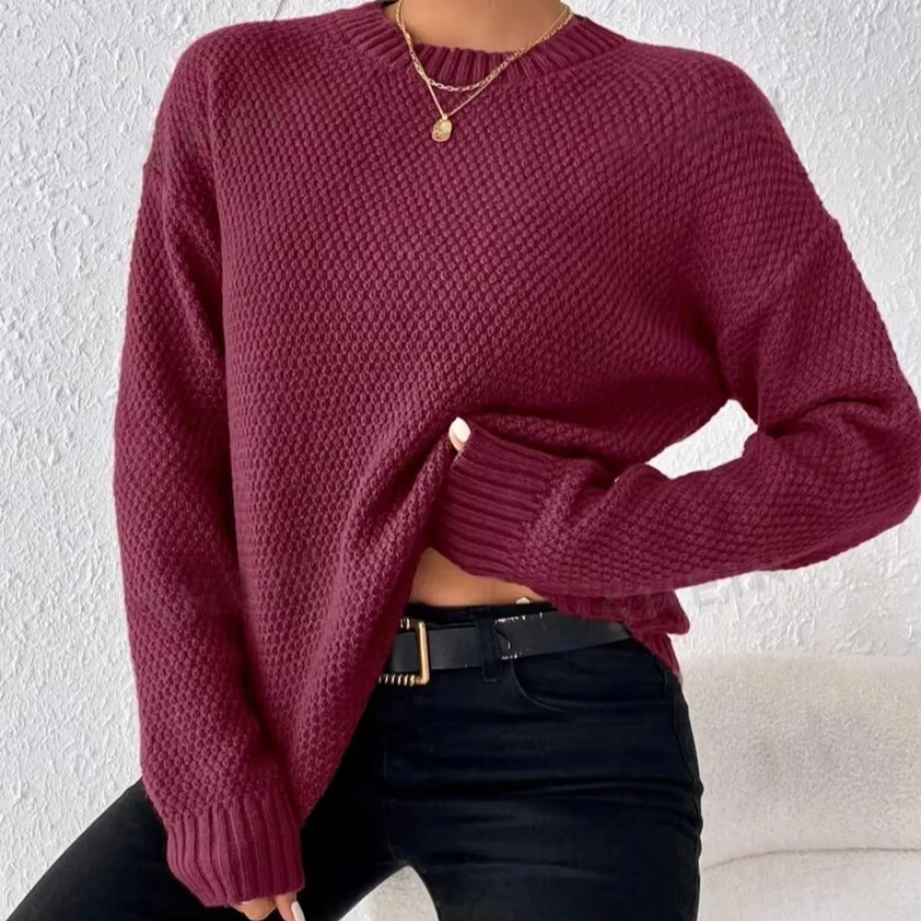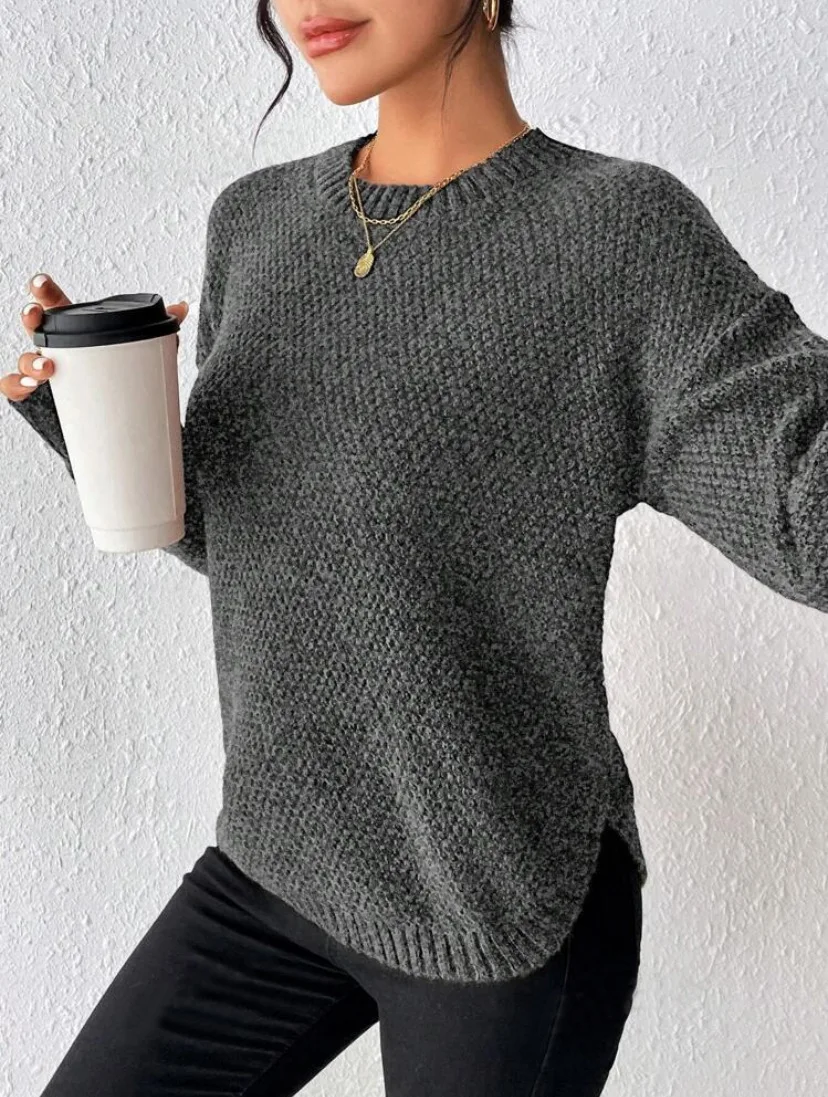 Simple All-Match Slit Design Women's Casual Long Knitted Pullover Sweater Solid Color for Autumn-Made in Europe United States