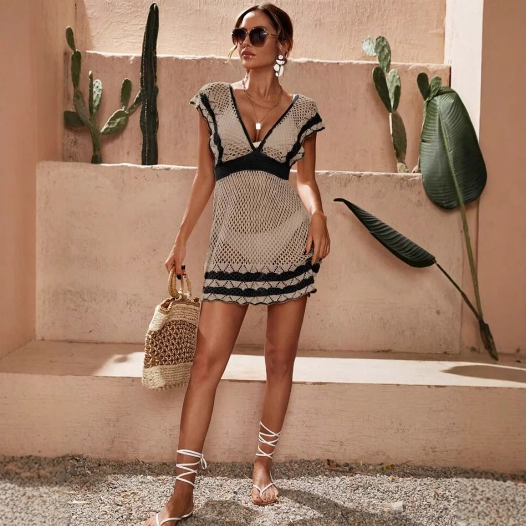 2025 Summer New Women Set Sexy Hollow-Out Backless Short Skirt Color-Block Knitted Tops Thin Breathable Casual Style