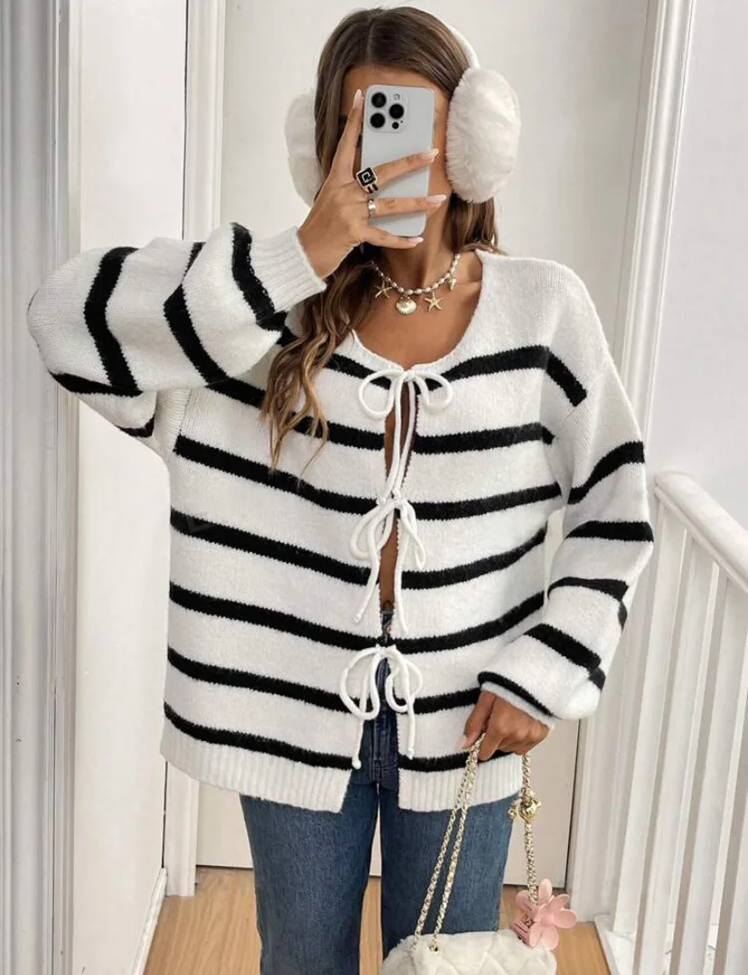 European American Style Casual Women's Cardigan Autumn Winter Striped Front Collar Solid Color Fashionable Loose Knit Sweater