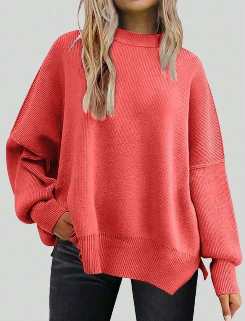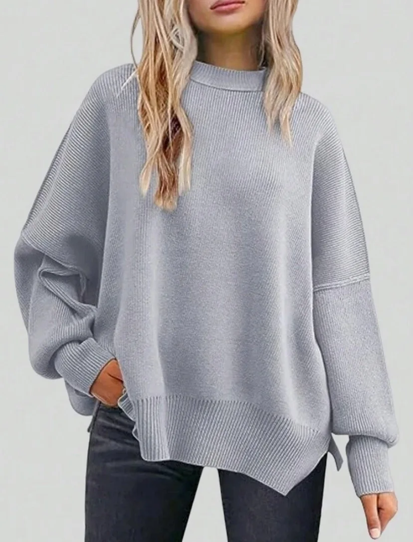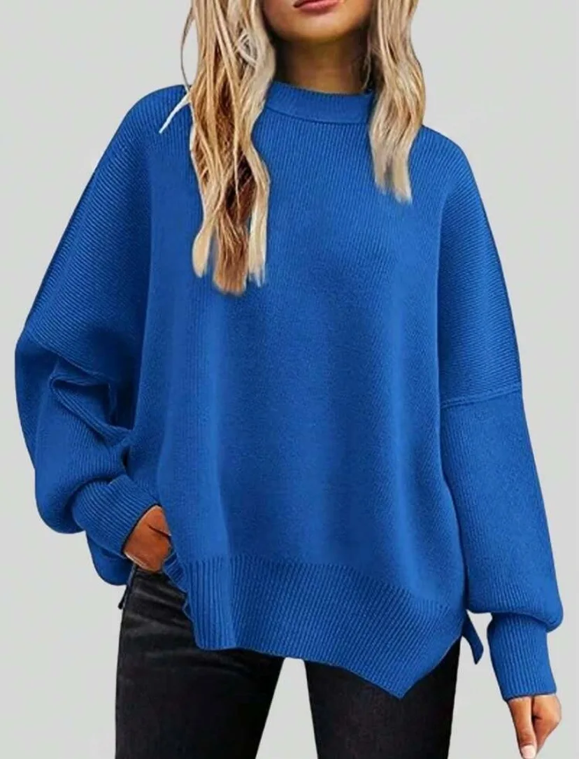 2025 Women's Neck Batwing Long Knitted Top Casual Fashionable Polyester Sweater Front Logo Washed Technics Featuring Side Slit