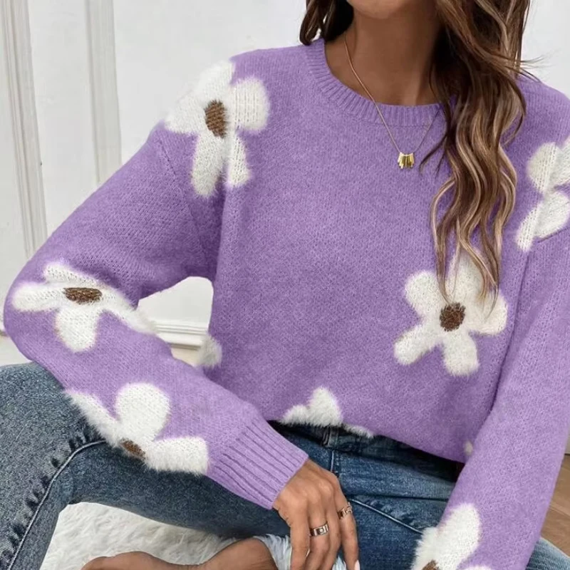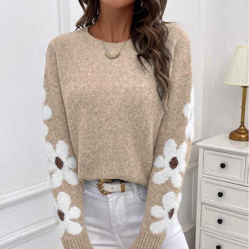 2024 Autumn Winter Elegant Flower Jacquard Knitted Pullover for Women with Front Logo Casual Style