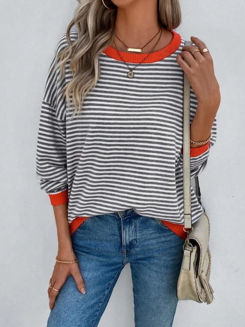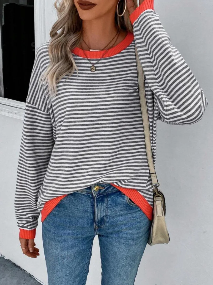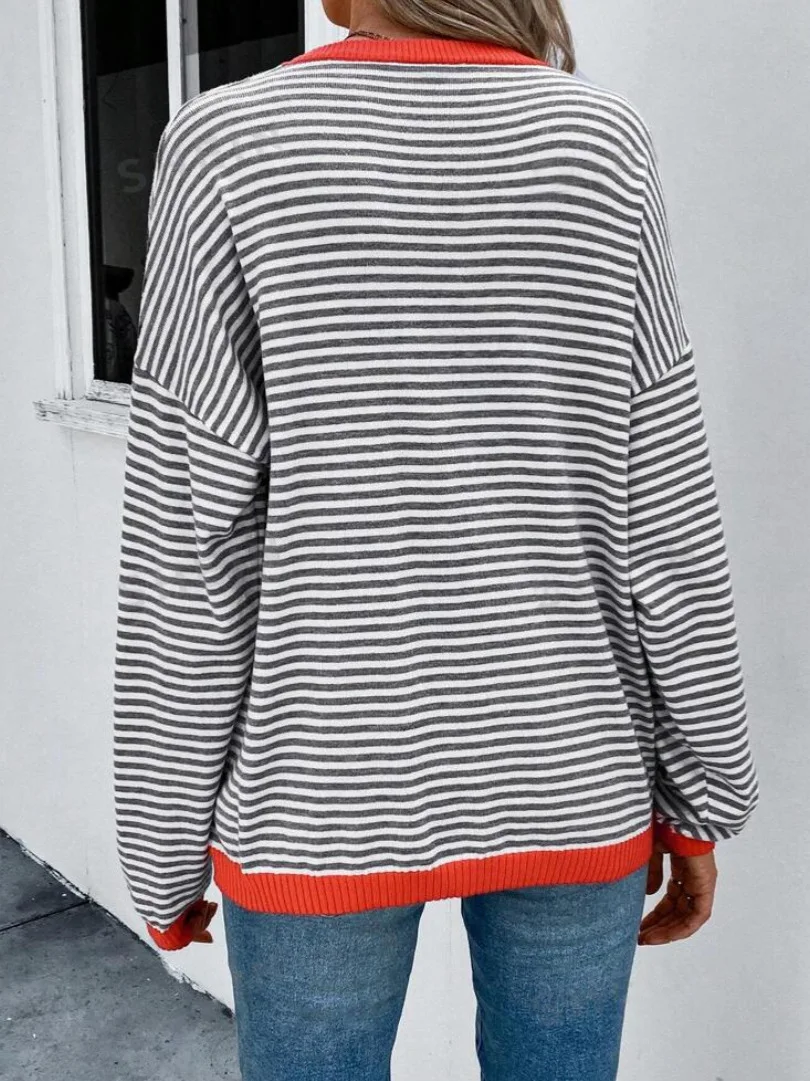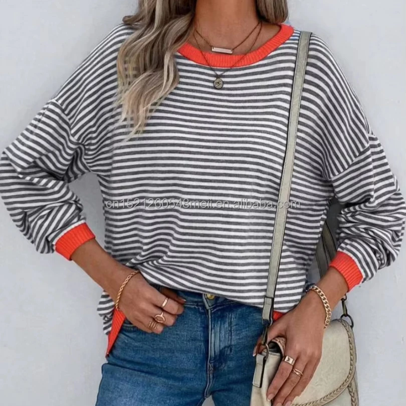 2025 New Arrival Women's Long-Sleeved Striped Round Neck Knitted Sweater Cotton Custom Logo Casual Clothes Vest Women's Top