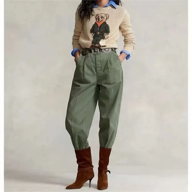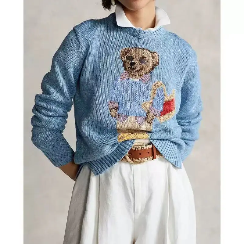 Women's Cute Cartoon Bear Knitted Pullover Sweater Woven Crew Neck Casual Top for Autumn Season Wholesale Clothing