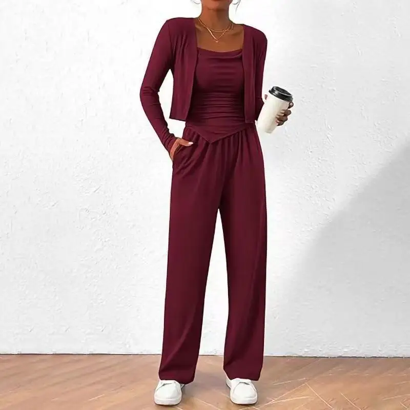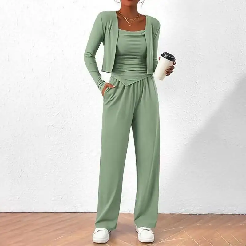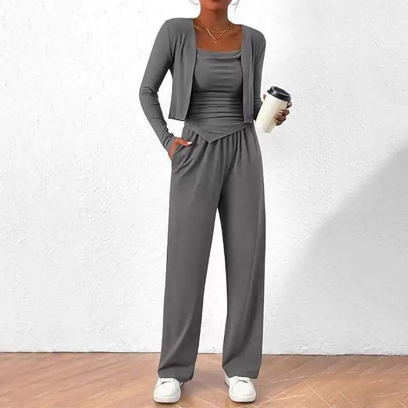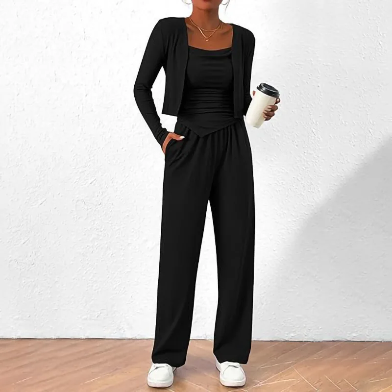 Women's Casual Solid Color 3-Piece Cardigan Set Vest Inner Top Wide Leg Pants Polyester for Autumn Wholesale Clothing