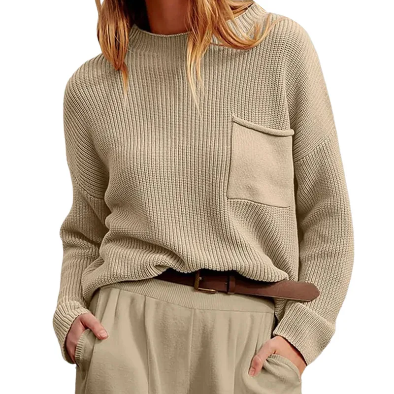 Wholesale Women Autumn Knit Sweater Casual Long Sleeve Round Neck Pullover with Front Pocket Knitwear Bulk Order