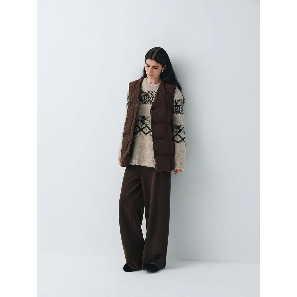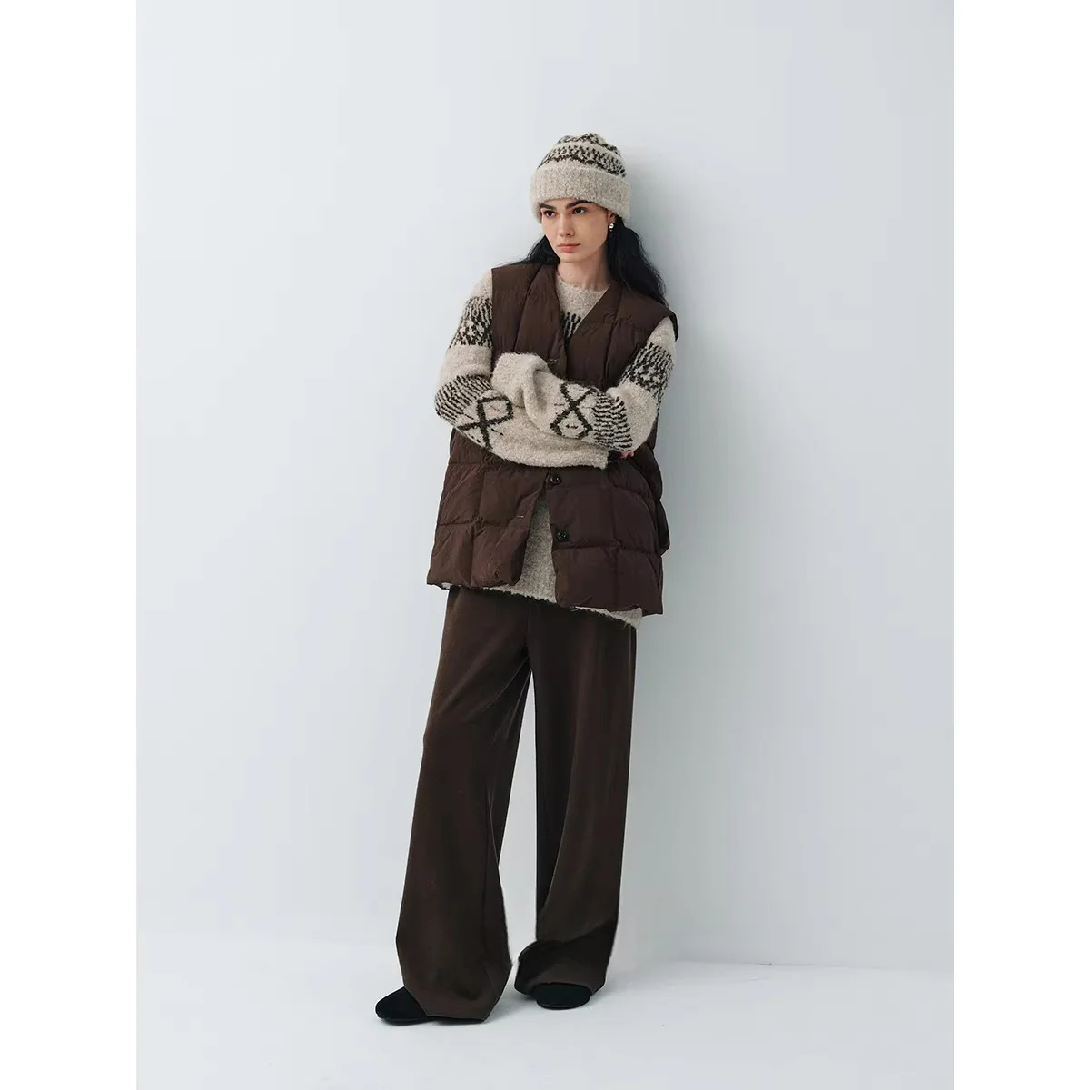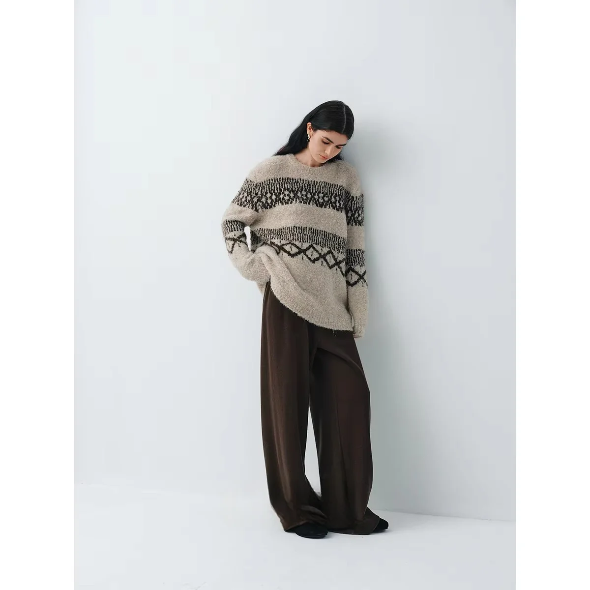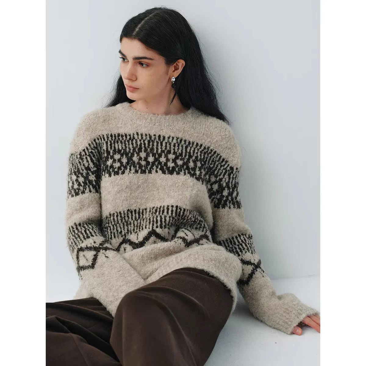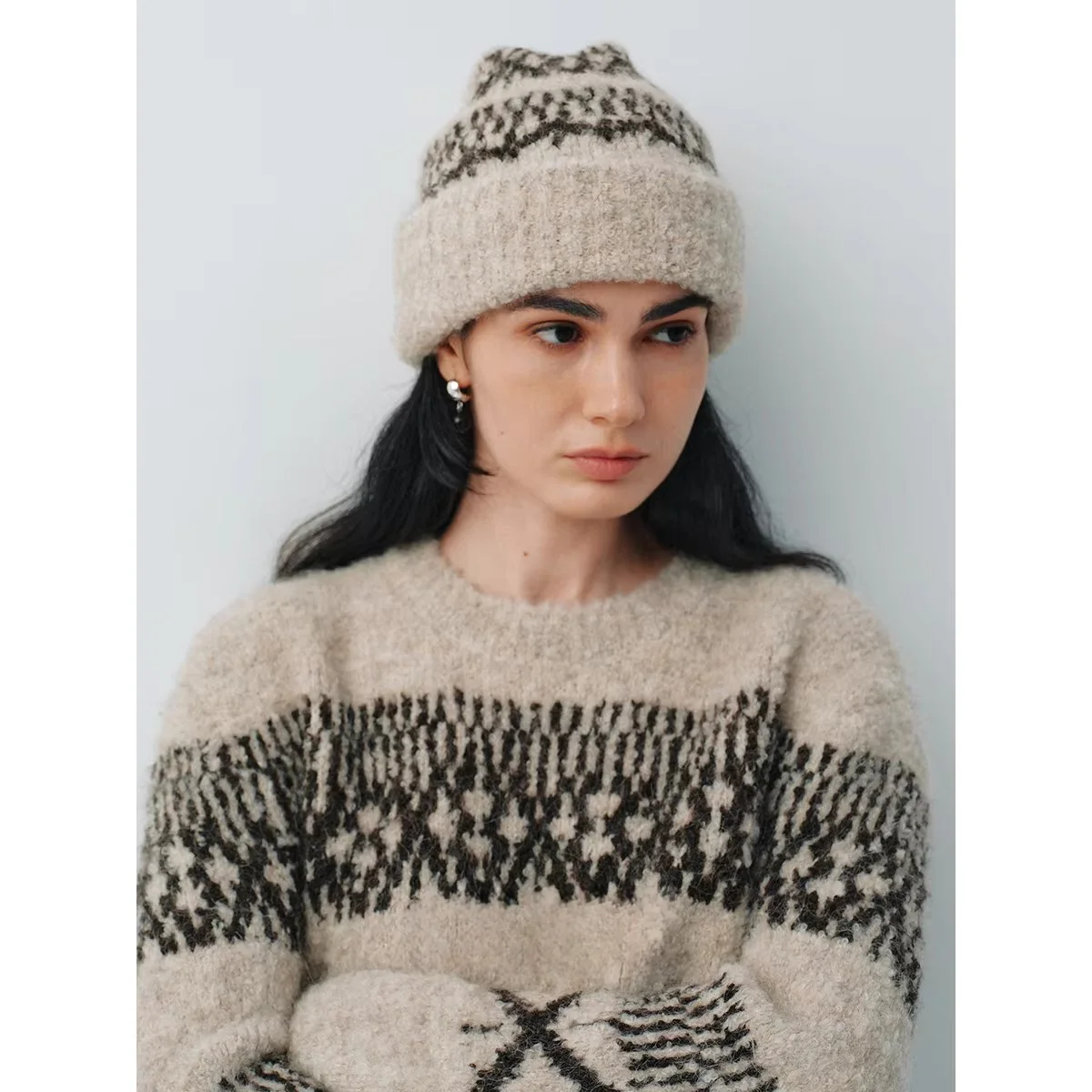 Fashionable Winter Essential Soft Alpaca Texture Loop Yarn Knitted Hat Fair Isle Sweater Set Geometric